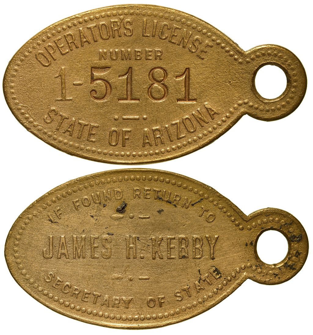 Operator`s License/ Number/ 1-5181/ State of Arizona// If Found, Return To/ James H. Kerby/ Secretary of State. Kerby, a Democrat, served as Arizona Secretary of State from 1933 - 1939.
