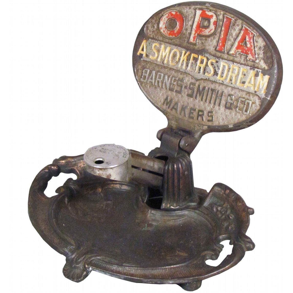 Opia Cast Iron Cigar Tip Cutter. The Brunhoff Mfg. Co. Patent date 1902. Nickel plating and paint worn on marquee otherwise good condition. 9 X 7 1/2 X 7 1/4 inches.