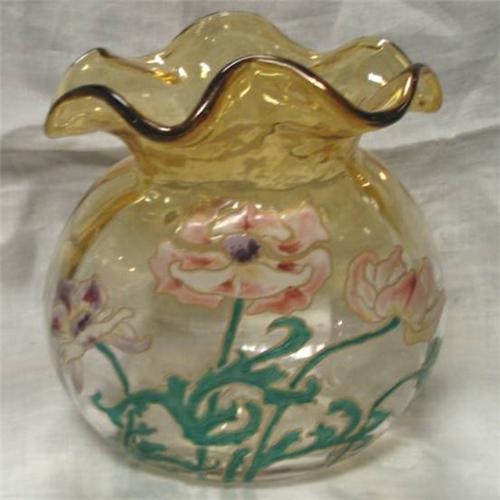 European vase, optic ribbed ovoid form with scalloped rim in amber glass decorated with pink flowering stems, attributed to Moser 7" tall, excelent condition, 1858-1924.