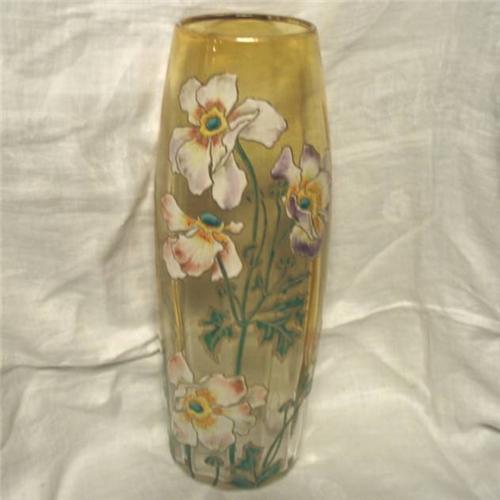 European vase, optic ribbed cylindrical form in amber glass, decorated with large pink flowers on green leafy stems, attributed to Moser. 15" tall, excelent condition, 1858-1924.