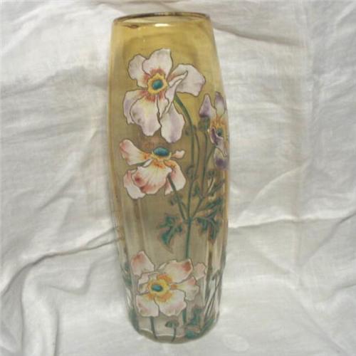European vase, optic ribbed cylindrical form in amber glass, decorated with large pink flowers on green leafy stems, attributed to Moser. 15" tall, excelent condition, 1858-1924.