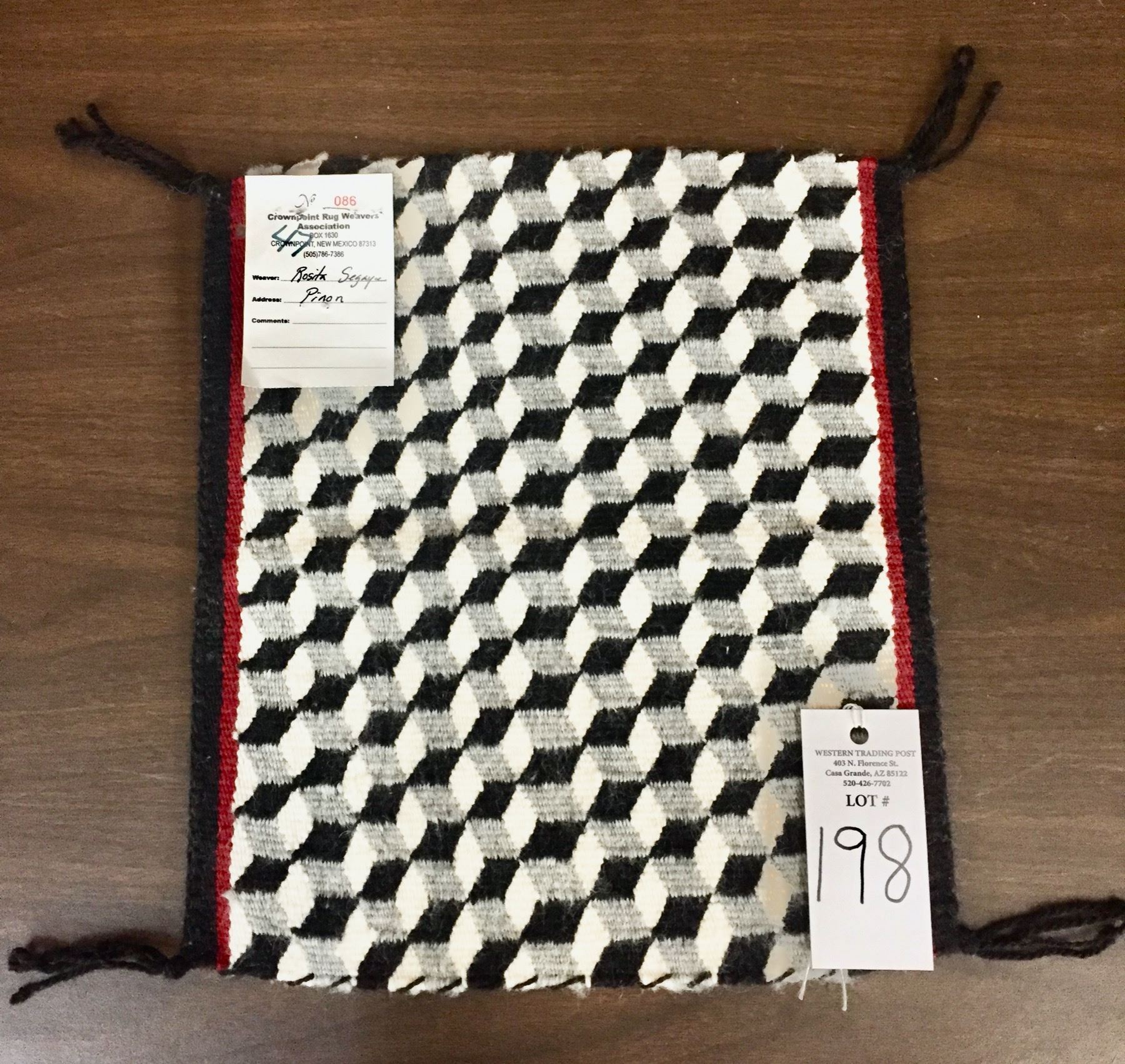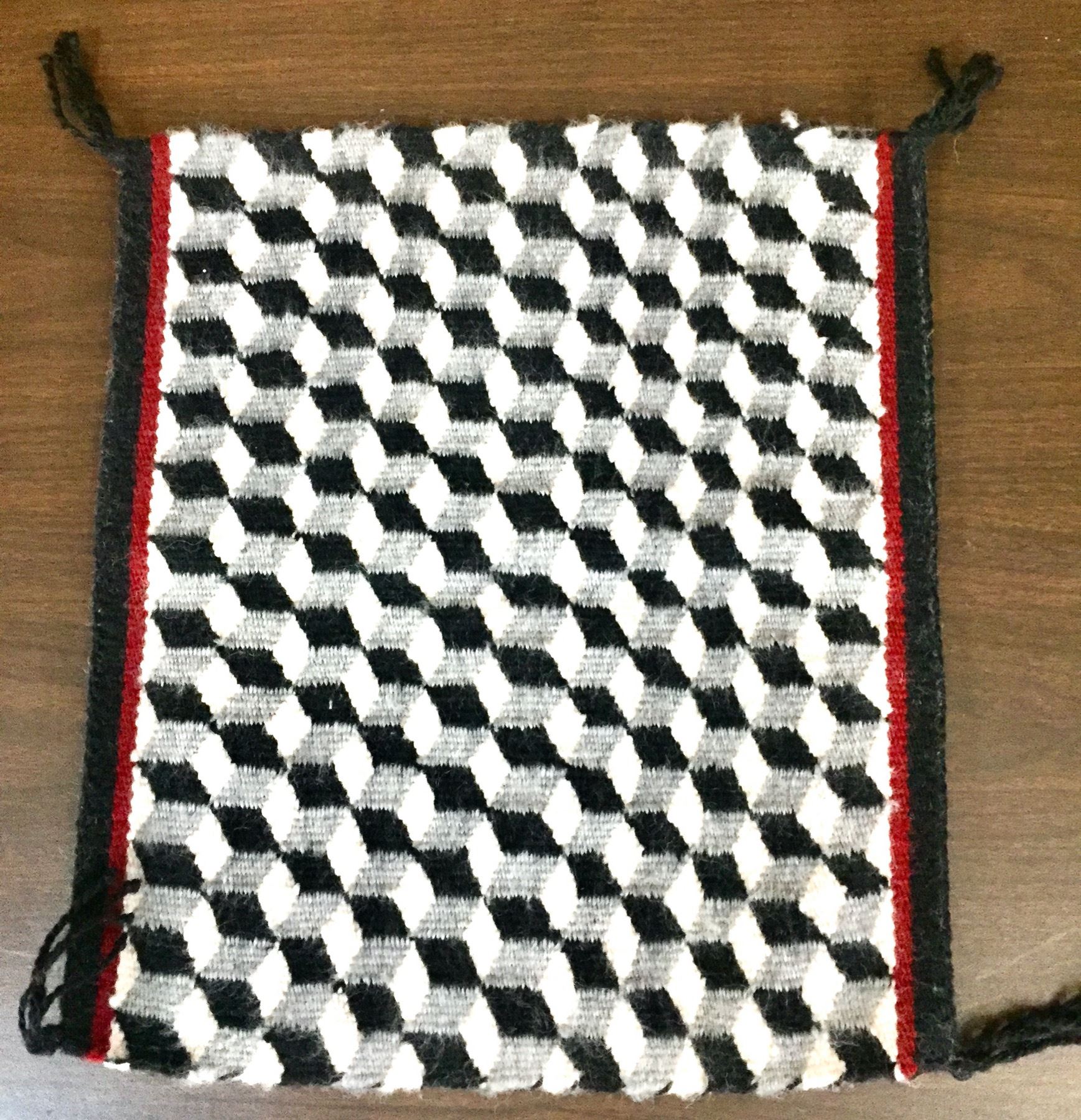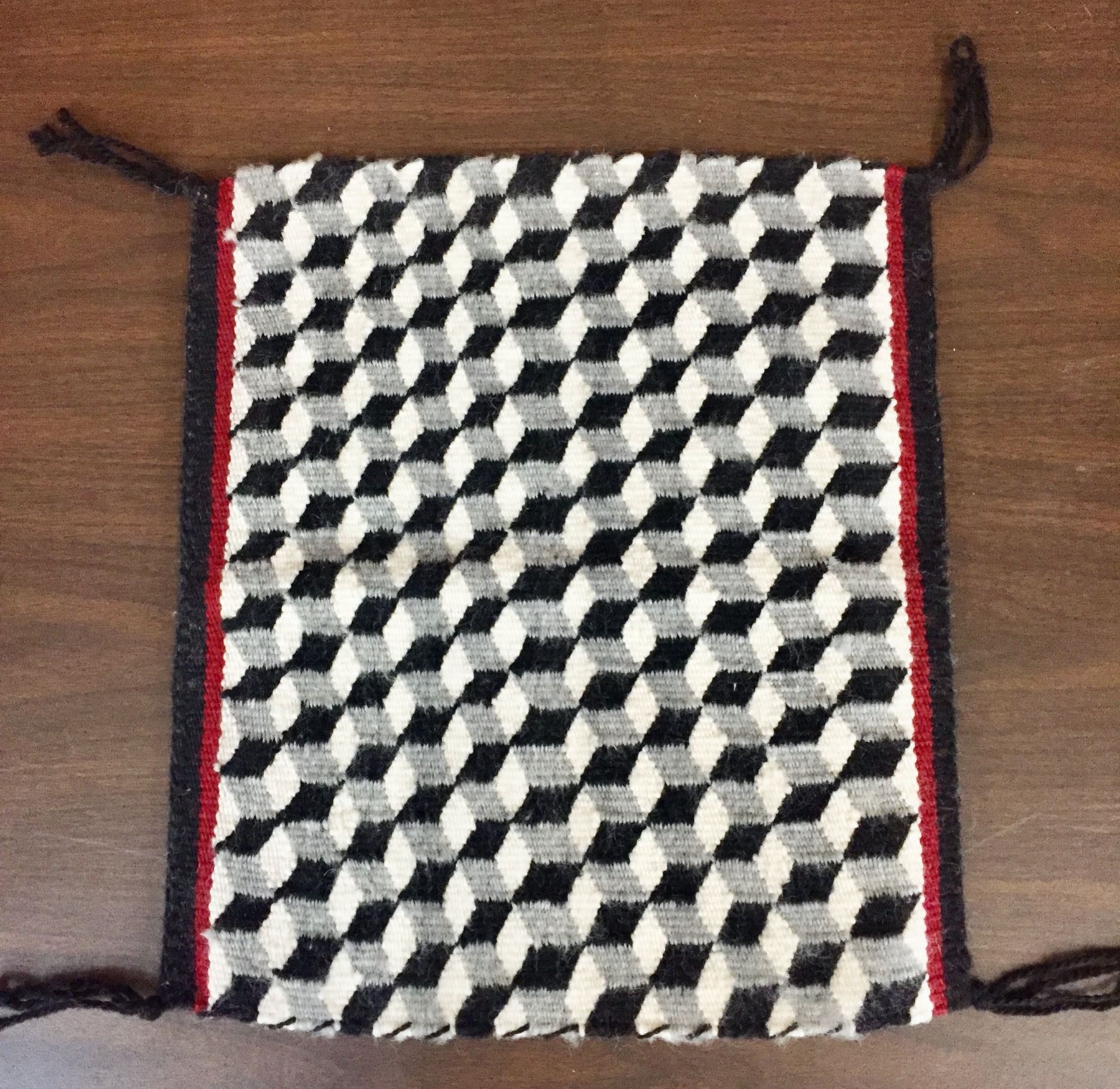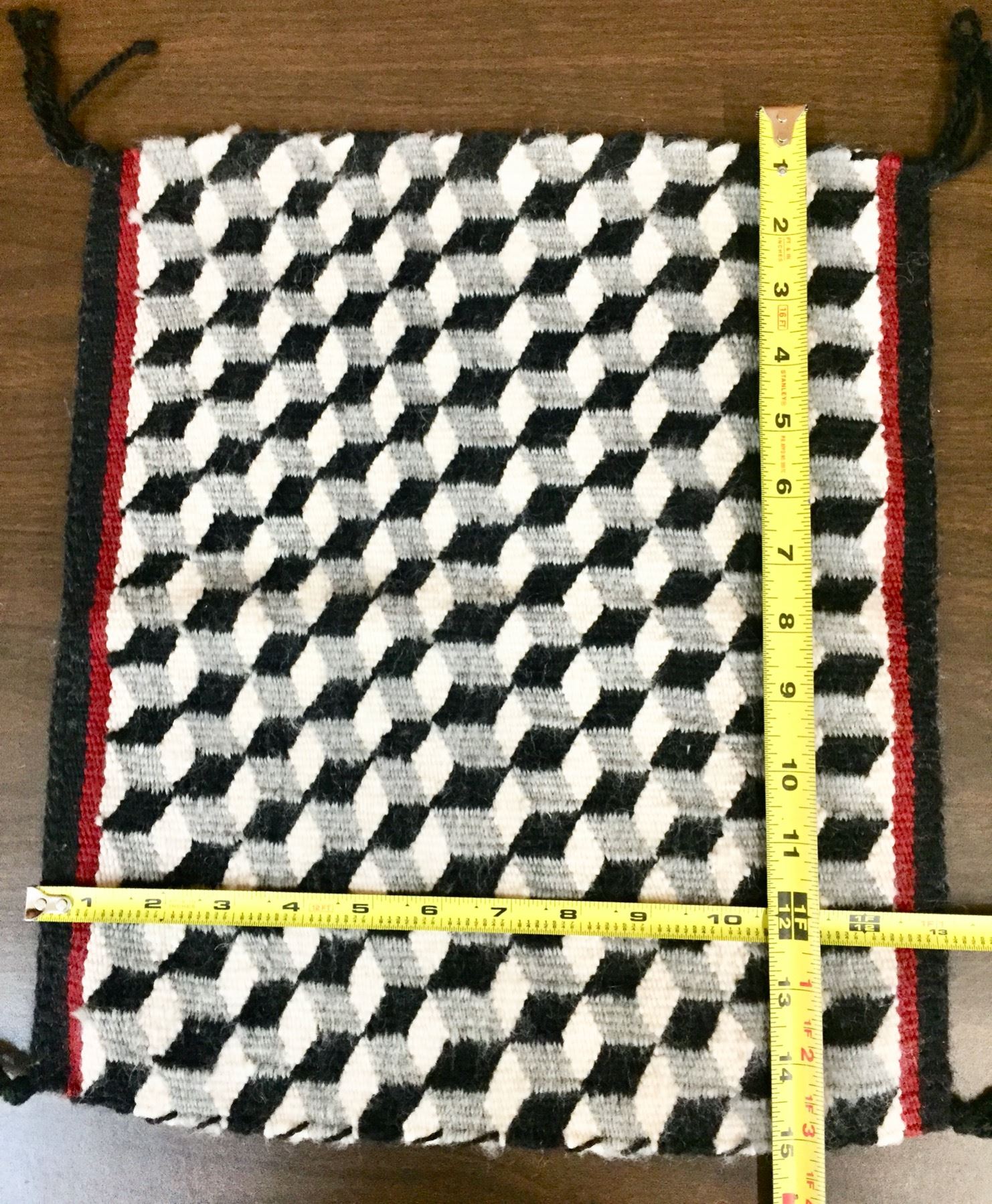 Description: For sale in this lot we have this exquisite little optical illusion Navajo textile by Rosita Begaye. It has a tight weave with black, white, gray, and red thread. Maker: Has a tag attached that says, Rosita Begaye. Approx. Age: Modern. Size: 13-1/2 inches wide x 15 inches long. Condition: Good for its age, normal wear expected. Please look closely at the pictures - they are an important part of our description. Shipping: There will be a $5 handling, packaging fee for shipping this lot. The actual cost of postage will be added on top of that.