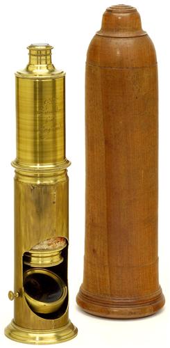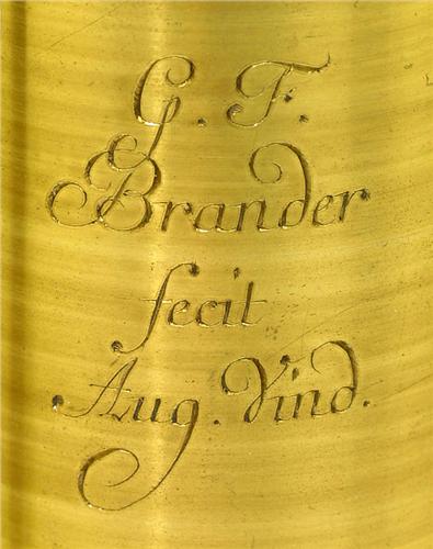 Distanzmesser "Georg Friedrich Brander", Augsburg" (Polymetroscopium Dioptricum), um 1760 Edles Messing-Instrument des Augsburger Gelehrten und Mechanicus. Signiert: "G. F. Brander fecit Aug. Vind.". Zaponiert, mit Sonnenschutz und Tag- und Nachtspiegel, Glasmikrometer-Scheibe im Zwischentubus. Höhe 26 cm. Mit außerordentlich seltener Original-Holzhülse. - Literatur: "G. F. Brander 1713-1783" (Deutsches Museum München 1983), S. 172-174. - Ein sensationell seltenes Sammlungsstück!