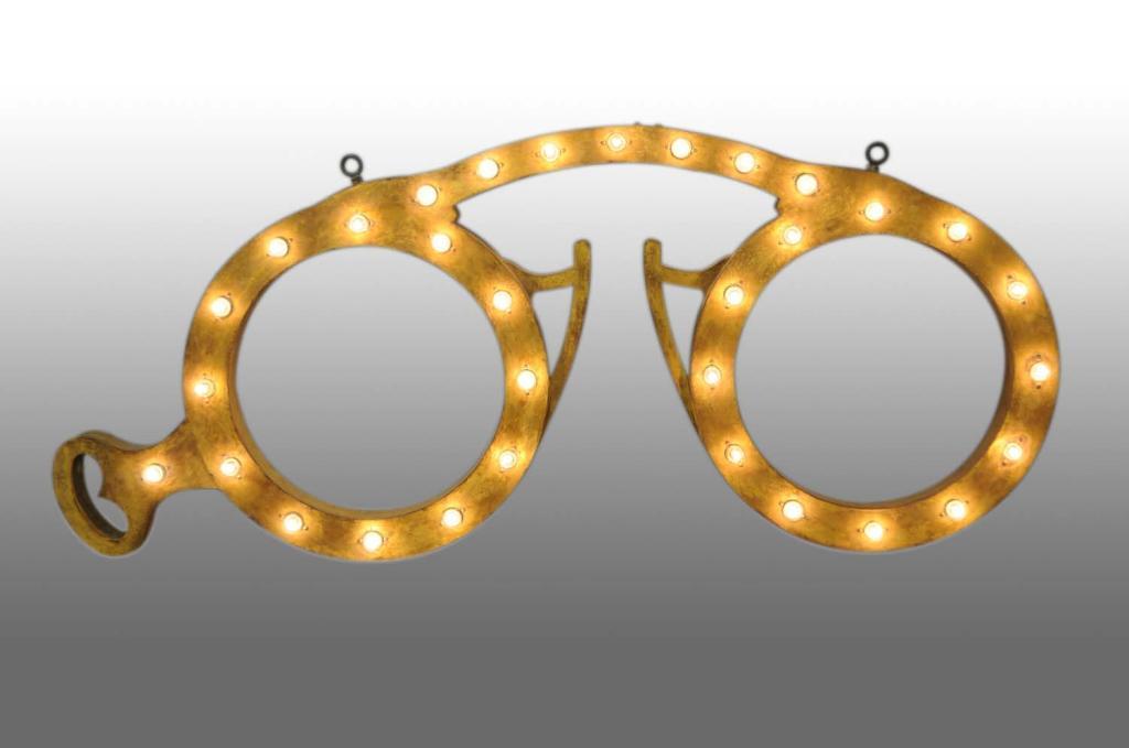 Double sided. Cira 1900. Metal with working lights around entire sign. Lights on both sides. Bracket to hang. Impressive sign. Condition (Excellent). Size 68" x 31".