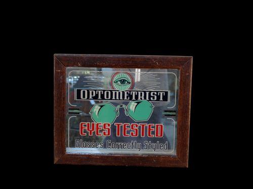 "Optometrist-Eyes Tested" Sign Mirrored Reverse Glass Trade Sign in wooden frame 13 x 16 "