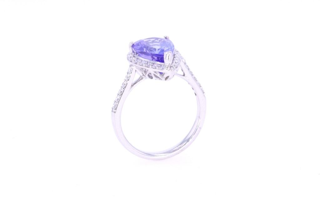 Featured in this lot is this exceptional 4.20ct Tanzanite and VS2 diamond, 18k white gold ring with AIGL paperwork. This ring shows one polished, stamped, and tested 18k white gold ring frame with a wonderful example of lattice work to the under gallery, an 'Orianne' hallmark, and a 18k gold stamp next to the hallmark on the inside of the ring band. The ring shows a center stone of pear modified brilliant cut tanzanite with measurements of 12.6mm x 8.7mm x 6.5mm, a collective weight of 4.20 carats, bluish violet coloration, and a very good cut grade. Tanzanite is a very rare precious gemstone that is only found in the Usumburu Mountains that border the Umba Valley of northern Tanzania. It was originally discovered in 1967 by Tiffany & Company, who named the stone Tanzanite. This example is unique due to its exceptional pleochroism (an optical phenomenon in which a stone has different colors when observed at different angles). The center stone and pave shoulders are lavishly decorated with 34 natural round brilliant cut diamonds that have measurements of 1.3mm - 1.5mm, a total weight of 0.45 carats, a color gradient of G – H, and VS2 - SI2 clarity. The piece comes complete with AIGL Inc. (American International Gemological Laboratories, Inc. a GIA certified lab AIGL#: K38E37-15522) report and appraisal, confirming the above info and giving a total value of $11,525.00. The ring size is US 7.