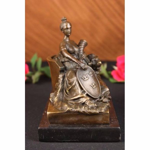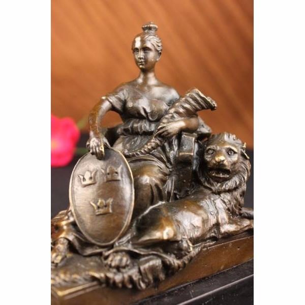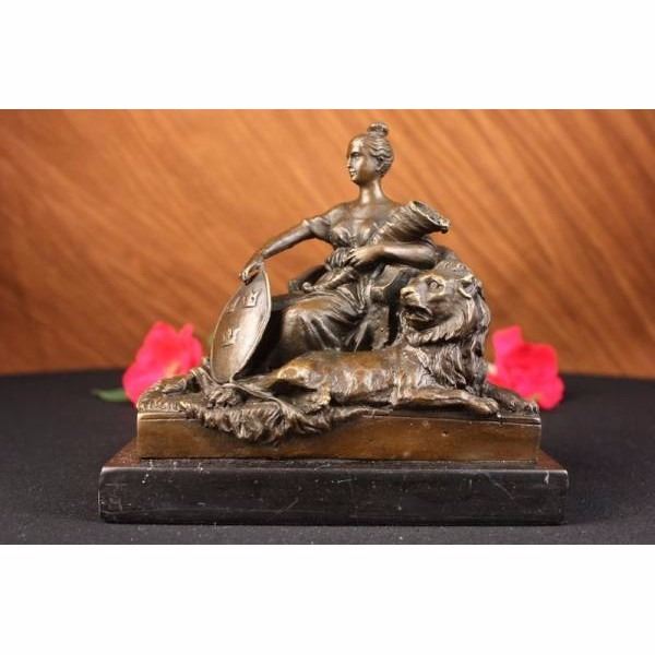 The noble maiden sits in a chair holding a shield and a cornucopia in the other arm. She stares out as though posing for a portrait with a majestic lion at her feet giving a combined regal air. The handmade bronze sculpture was molded using the ancient method of lost-wax casting and stained with a brown patina finish for preservation. It is mounted upon a black marble bae. Bronze Dimensions with Marble Base: Height 5 X Width 5 inches. Weight: 4 LBS.