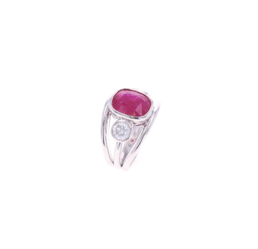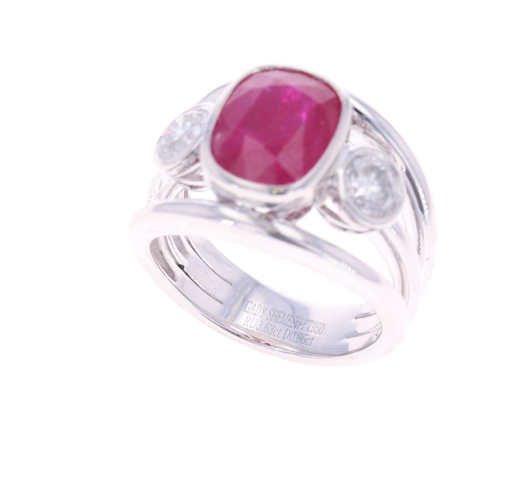 Featured in this lot is this opulent Burmese ruby and diamond platinum ring with AIGL and GIA paperwork. The ring features a polished, tested, and stamped platinum construction. The ring is marked with 'Gary Shemesh' on the underside of the ring band. The ring shows a natural cushion cut Burmese Ruby that shows measurements of 10.52 x 8.30 x 4.76mm with red coloration and a total weight of 3.63cts.The ring side stones shows a total of 2 round brilliant diamonds that shows 5mm measurements and SI1-SI2 clarity and a H coloration with a total weight of 0.96cts. The piece comes complete with AIGL Inc.(American International Gemological Laboratories, Inc. a GIA certified lab AIGL#: K62E91-EA19234) report and appraisal confirming the above info and giving a total value of $18,784.00. GIA (Gemological Institute of America) Ruby Grading Report#: 1236137483. The ring size is US 7.