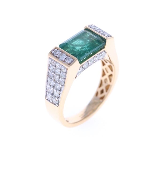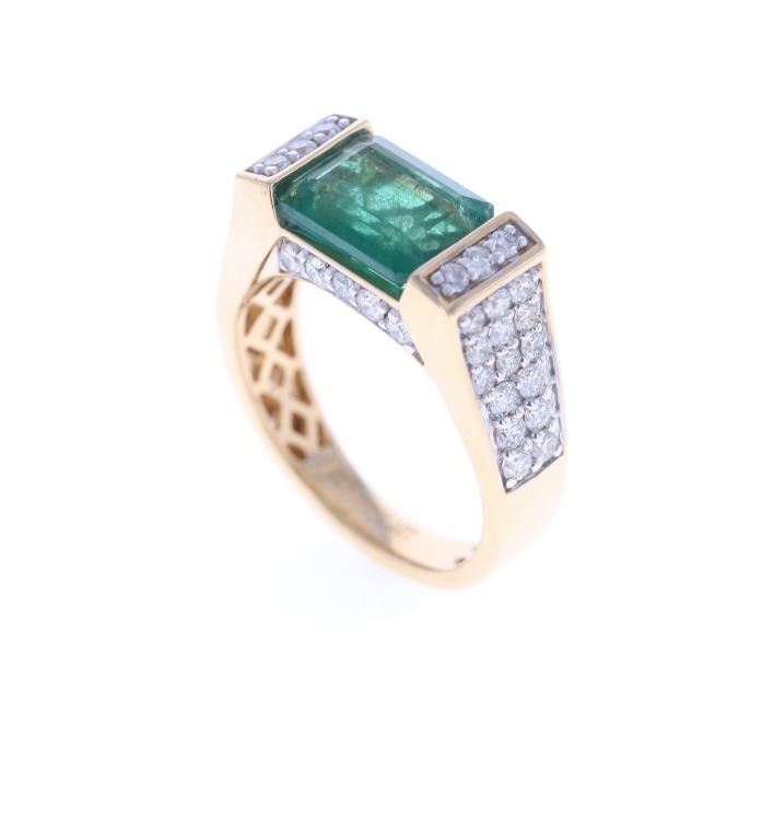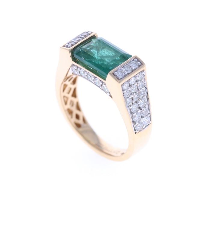 Featured in this lot is this opulent emerald and VS2 diamond 18k yellow gold ring with SGL paperwork. The ring features a polished, stamped and tested 18k yellow gold raise lattice ring band with a Oscar Friedman hallmark and shows a '18k'