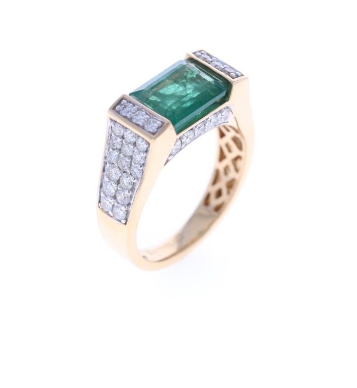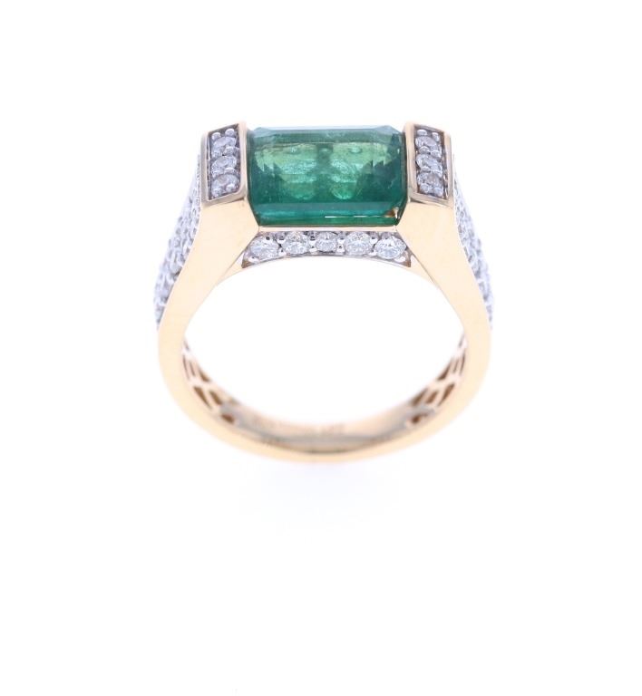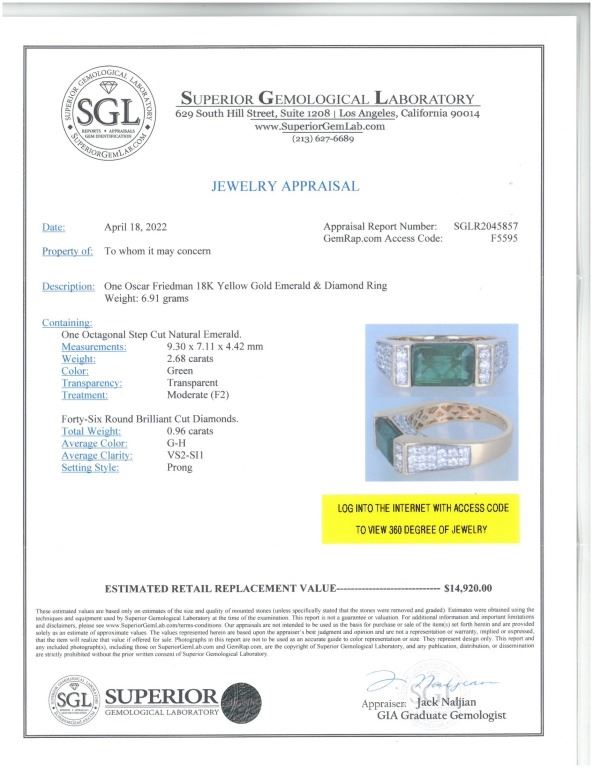 gold stamp next to the hallmark. The center stone is a octagonal step cut natural emerald with measurements of 9.30 x 7.11 x 4.42mm and shows a green coloration with a transparent appearance and shows moderate (F2) treatment with a total weight of 2.68 carats. The raised lattice and beautiful pave set shoulders are profusely decorated with a total of 46 round brilliant cut diamonds that show an average color of G-H and an average clarity of VS2-SI1 with a prong set style and a total weight of 0.96 carats. The piece comes complete with SGL (Superior Gemological Laboratory, Inc. a GIA certified lab SGL#: SGLR2045857 with the access code of F5595 at GemRap.com) report and appraisal confirming the above info and giving a total value of $14,920.00. The ring size is US 7.