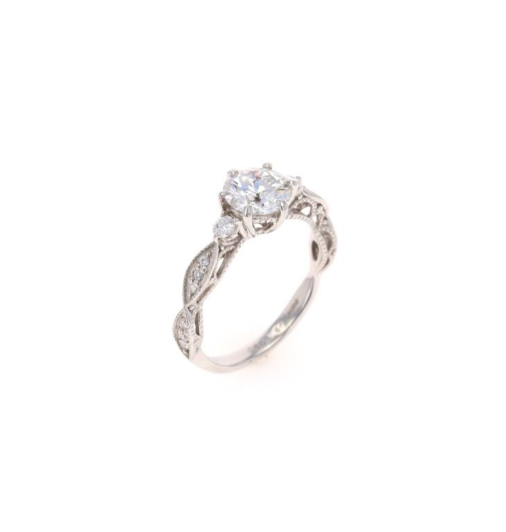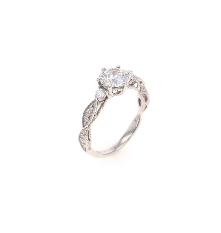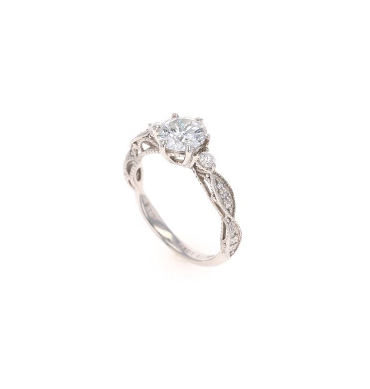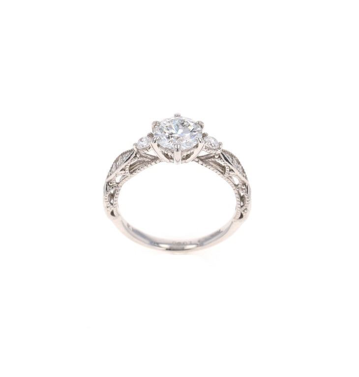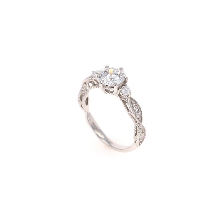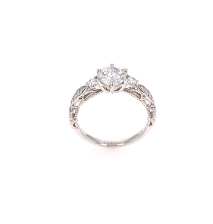 Featured in this lot is this opulent three stone diamond and platinum ring. The ring features a wonderfully and professionally crafted platinum construction that features a 'PT900' marking along with a '1090' serial number and a weight for the '0.18'. The centerstone is a round brilliant cut diamond that shows a total weight of 1.09 carats. The centerstone and the intricate shoulders is decorated with a total of 14 round brilliant cut diamonds with a total weight of 0.18 carats. The ring size is US 6.