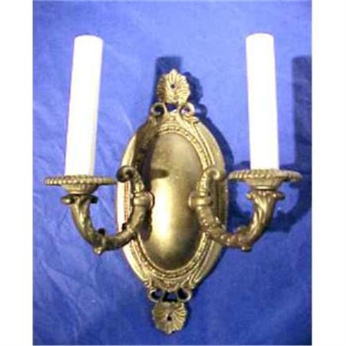 Opulent Victorian wall sconce. Very fine casting in brass with what appears to be a gold wash on the surface over the brass- It?s very classical in design with a rococo style shell on top & bottom. This two light wall sconce is already re-wired & ready to install. There?s no switch or pull chain so it has to be wired directly into wall box - it takes a candelabra base bulb. This is a nice sconce with no problems. The back plate measures 10 ½? long & 4 3/8? w ?overall width across the two branches is aprox 8?.