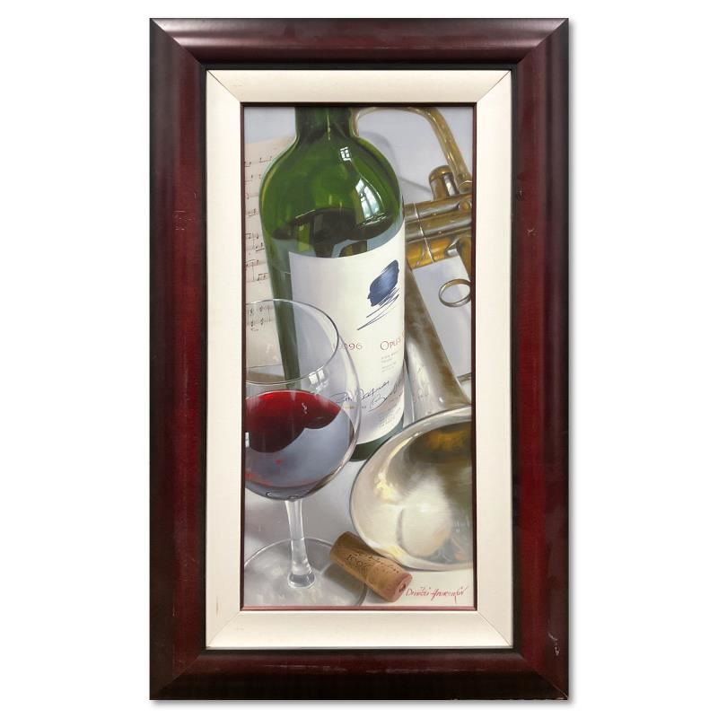 "Opus and Horn" is a hand embellished limited edition giclee on canvas by Dmitri Annenkov, numbered 47/195 inverso and hand signed by the artist. This piece comes framed. Includes Letter of Authenticity. Measures approx. 47" x 27.5" (frame), 35" x 15" (image). There is some wear on the frame.