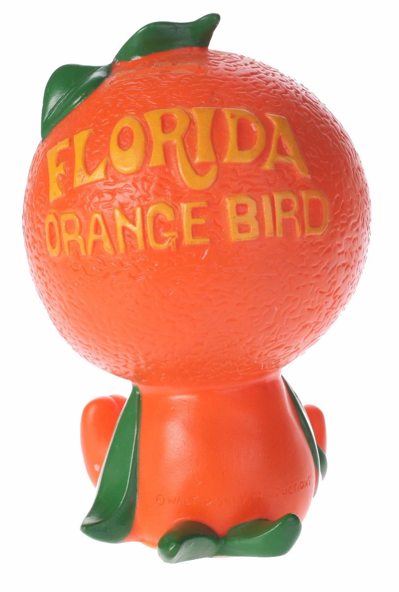 (Walt Disney World, 1970s) Includes (1) Florida Orange Bird bank with textured orange head, and (1) small pin featuring the Orange Bird. In good condition.