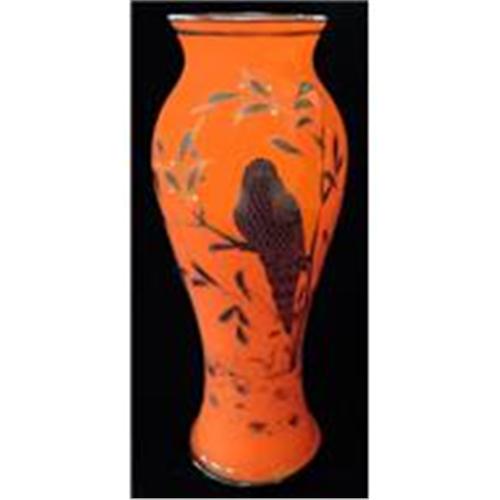 This large 10 1/2 inches tall orange Tango glass vase was produced in Czechoslovakia during the early 20th century and has an acid etched marked underneath. Decorated with a detailed black parakeet sitting on a branch with numerous sprigs of silver and black leaves. Entirely in excellent condition with no chips, cracks or other damage.