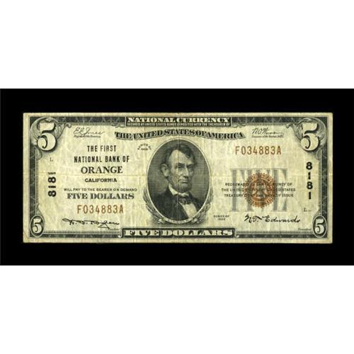 <B>Orange, CA</B></I> - $5 1929 Ty. 1 <B>The First NB</B></I> Ch. # 8181<BR> A nice problem free <B>Fine-Very Fine</B></I> example, ex-our sale of the Lowell Horwedel Collection in September of 2004, where it realized $632.50. It should be worth no less today. <BR><BR><b>Shipping:</b> Coins & Currency (<a target="_blank" href="http://www.heritageauctions.com/common/shipping.php">view shipping information</a>)