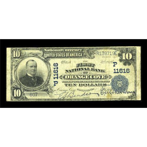 <B>Orange Cove, CA</B></I> - $10 1902 Plain Back Fr. 632 <B>The First NB</B></I> Ch. # (P)11616<BR> Although small notes from this evocatively titled Fresno County community are frequently offered, large examples are another story entirely, with the current count standing at five, including this piece, which is the only $10 note in that listing. <B>Very Good-Fine,</B></I> with strong signatures. <BR><I>From The Kansas City Collection.</B></I><BR><BR><b>Shipping:</b> Coins & Currency (<a target="_blank" href="http://www.heritageauctions.com/common/shipping.php">view shipping information</a>)