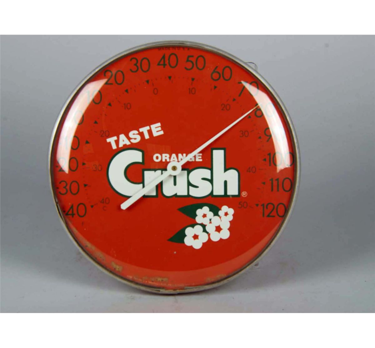 Thermometer has lithographed face advertising Orange Crush. Circa 1960s. Condition (Good). Size 12" in diameter
