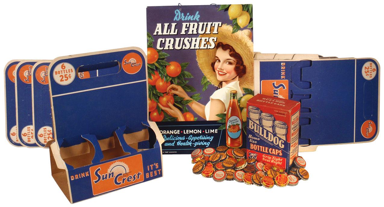 Orange-Crush litho on cdbd sign w/pretty girl, Sun Crest cdbd bottle carriers (6) & box of 100+ new old stock Bulldog Bottle Caps, caps are all adv caps for Freshway Orange, Try-Me Gold Orange Soda, White Soda, Golden Ginger Ale, Barq's Strawberry Soda, etc., all in Exc cond, sign is 13.5"H x 9.5"W.