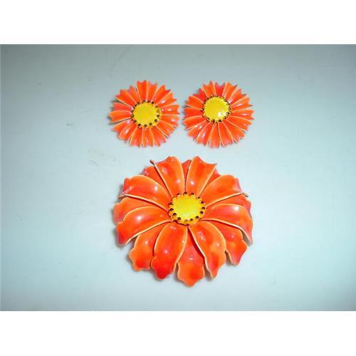 <tr><td>Title:Orange Enamel Flower Brooch and Earing Set</td></tr>