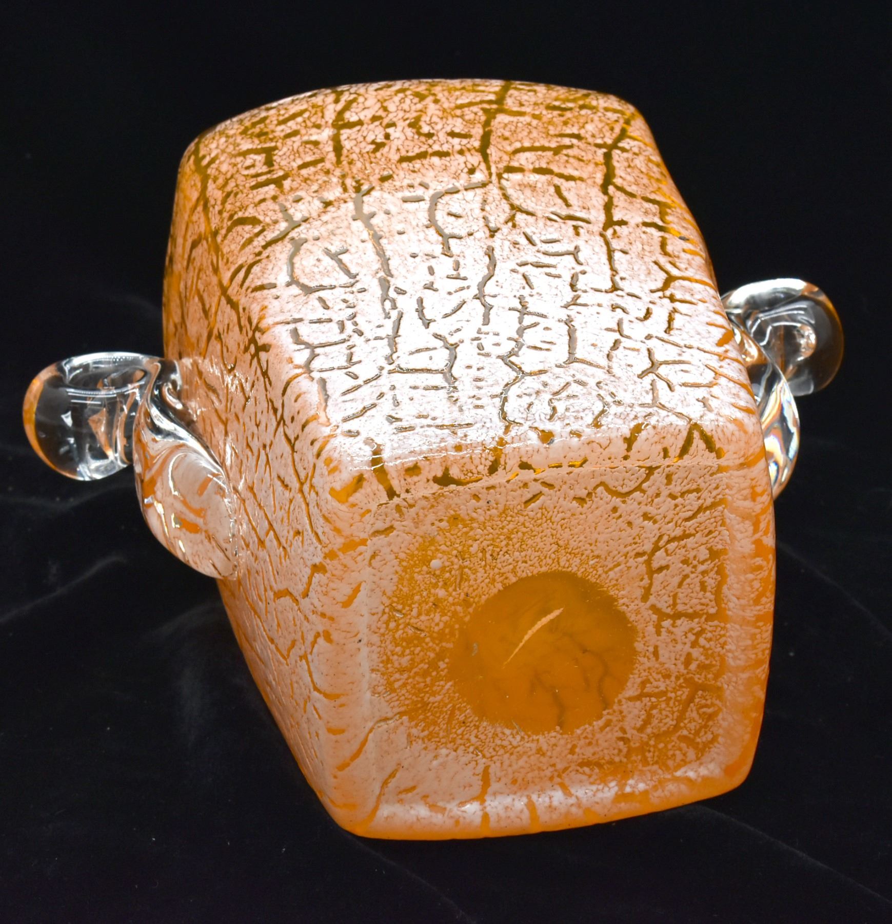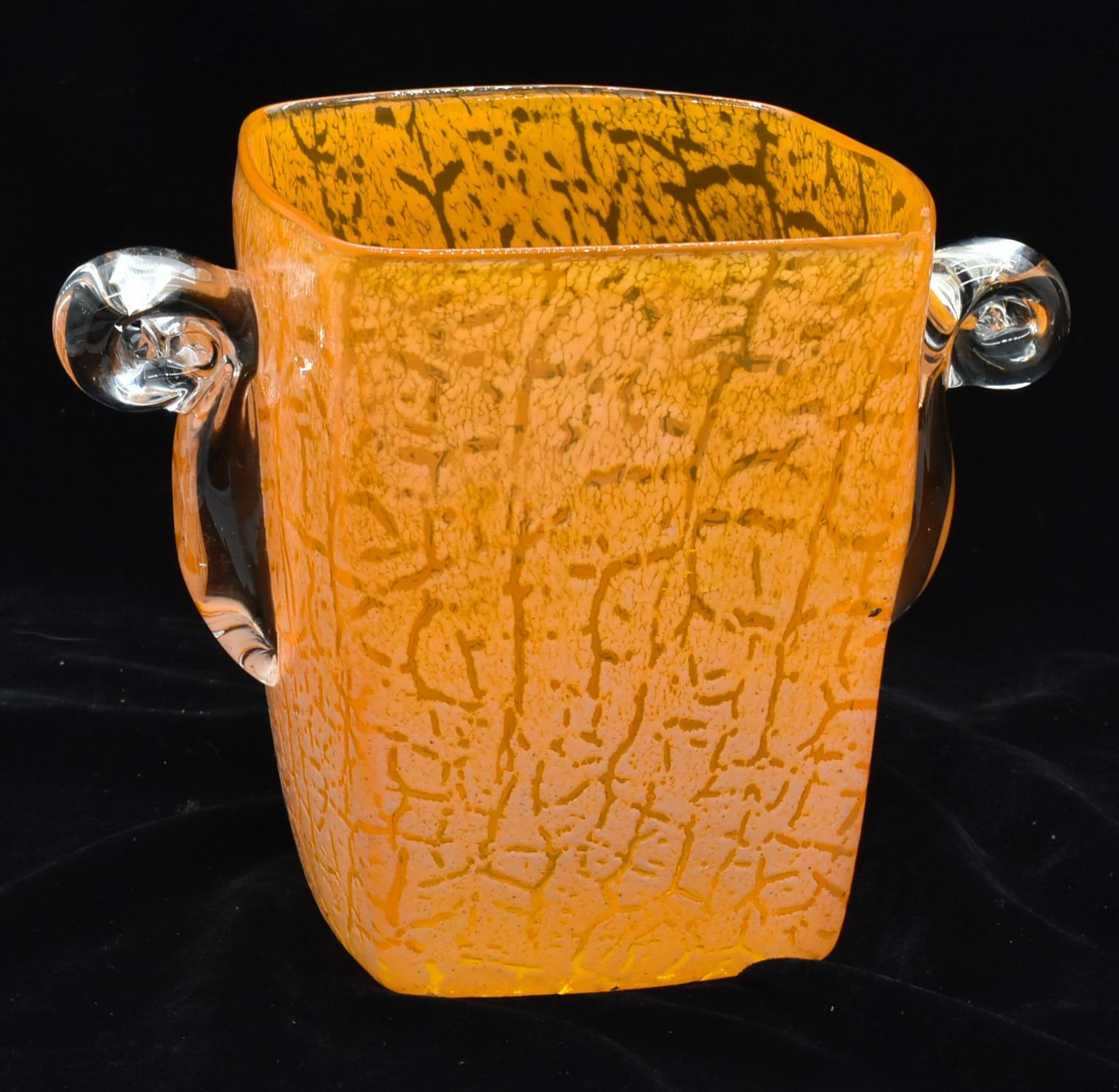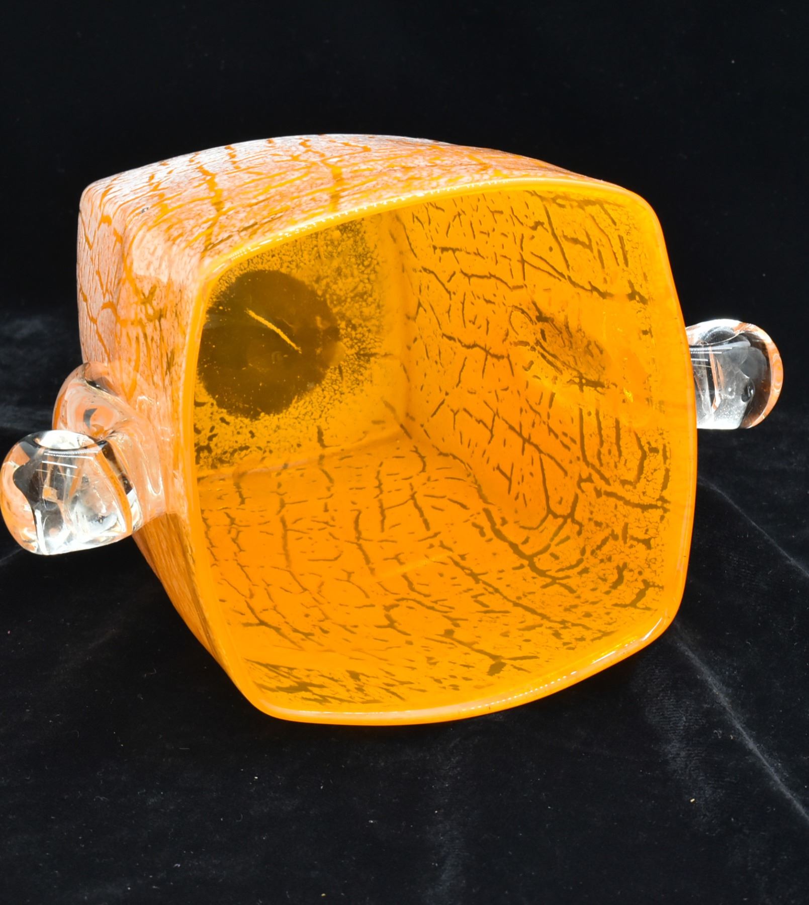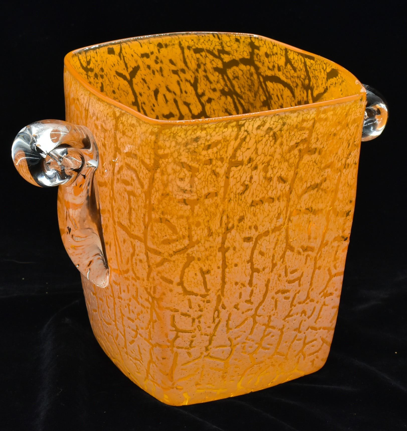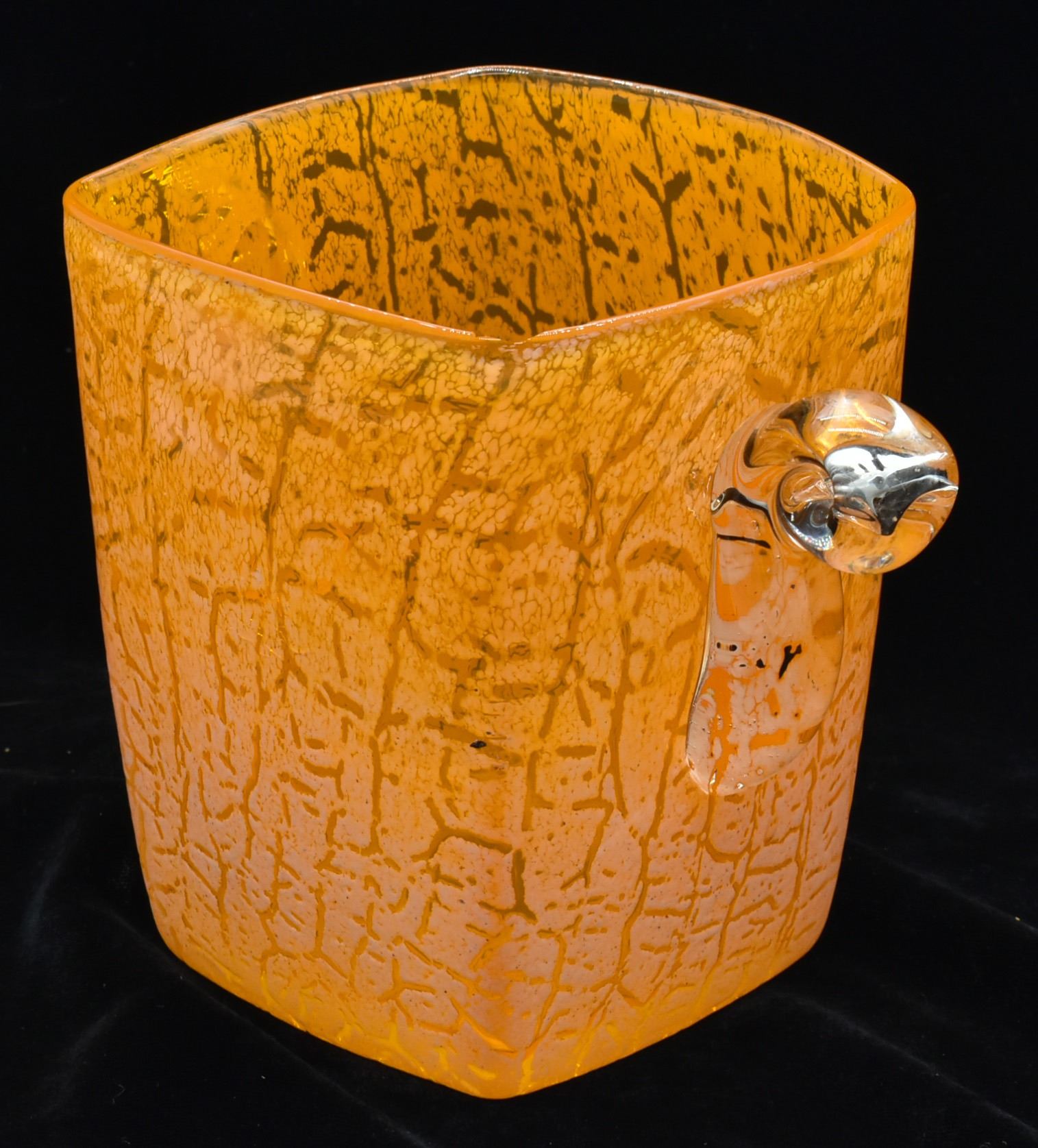 Orange Fused Glass Handled Square Ice Bucket. This unusual piece Stands 6'' tall and is 8'' wide handle to handle. Clear glass on orange.