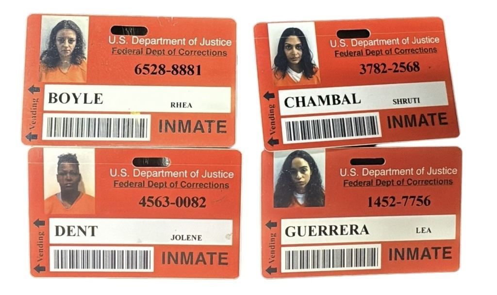 Original set of 4 prison ID's used in the production of the Jenji Kohan created comedy-drama television series 'Orange Is the New Black' (2013–2019), based on Piper Kerman's memoir Orange Is the New Black: My Year in a Women's Prison (2010), about her experiences at FCI Danbury, a minimum security federal prison.