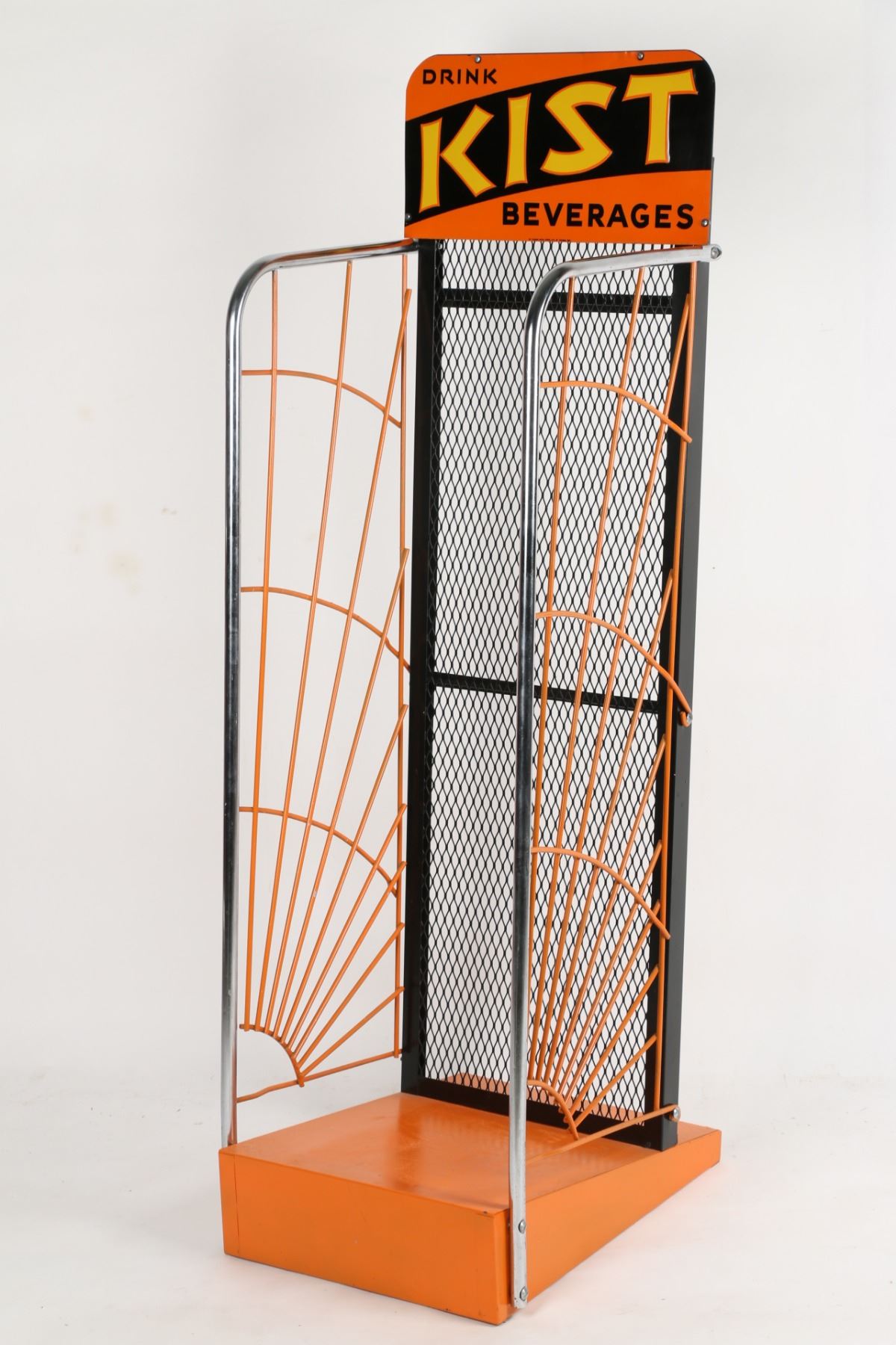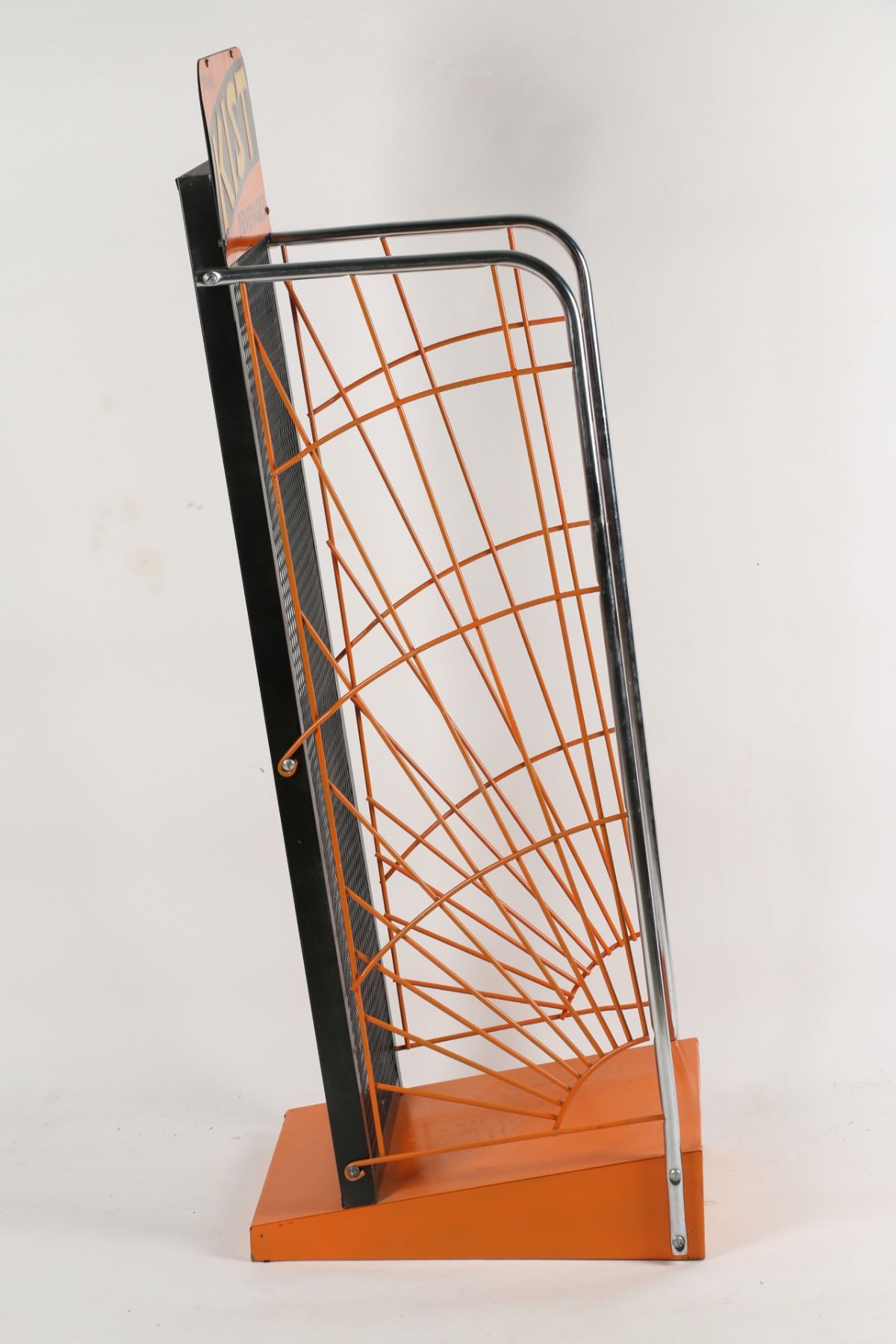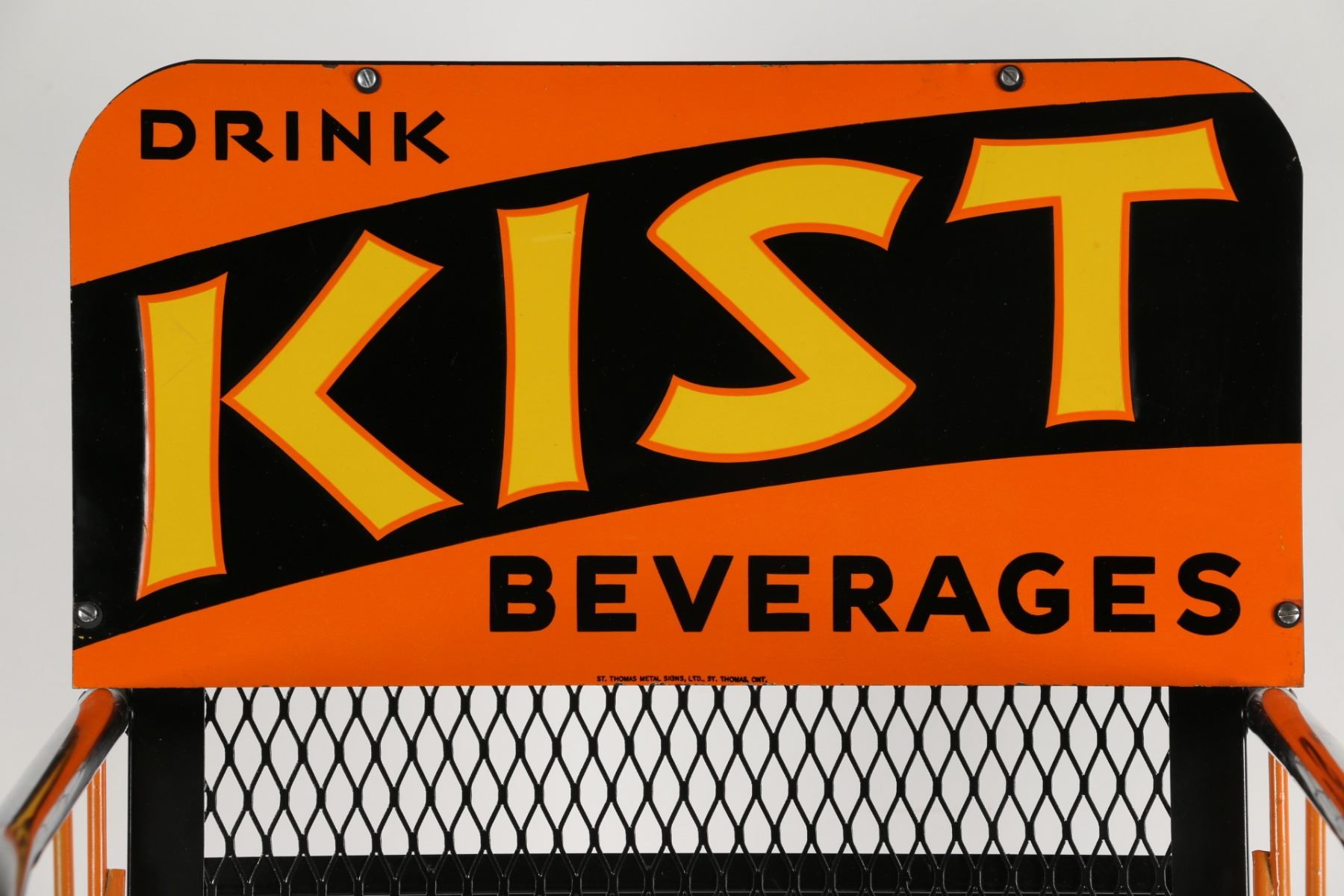 Canadian. Circa 1940s. Embossed sign. Art Deco. Marked, "St. Thomas Metal Signs Limited, St. Thomas" lower edge. 54.5" x 16.75" x 20.5". Sign: untouched original. Very minor edge creases. Rack: professionally restored. $200-300.