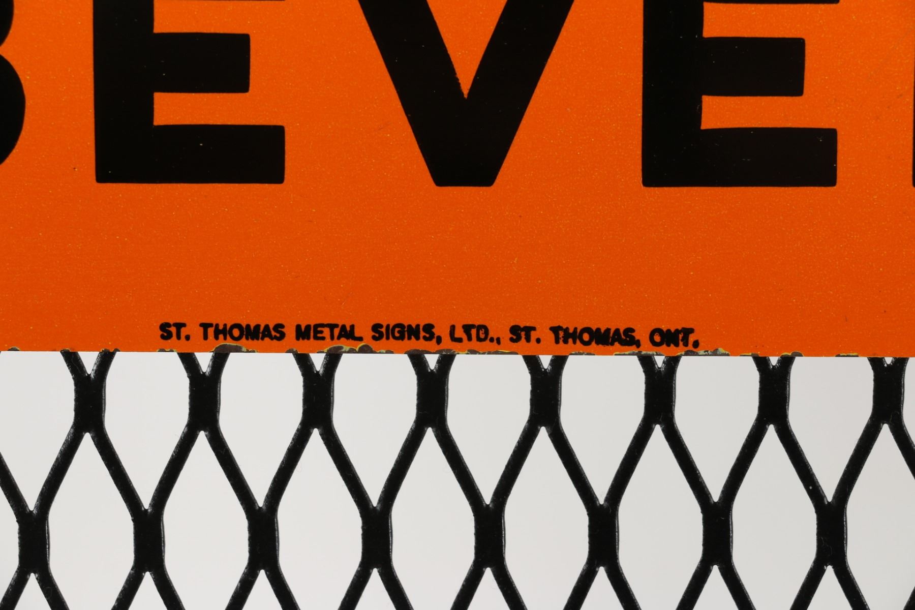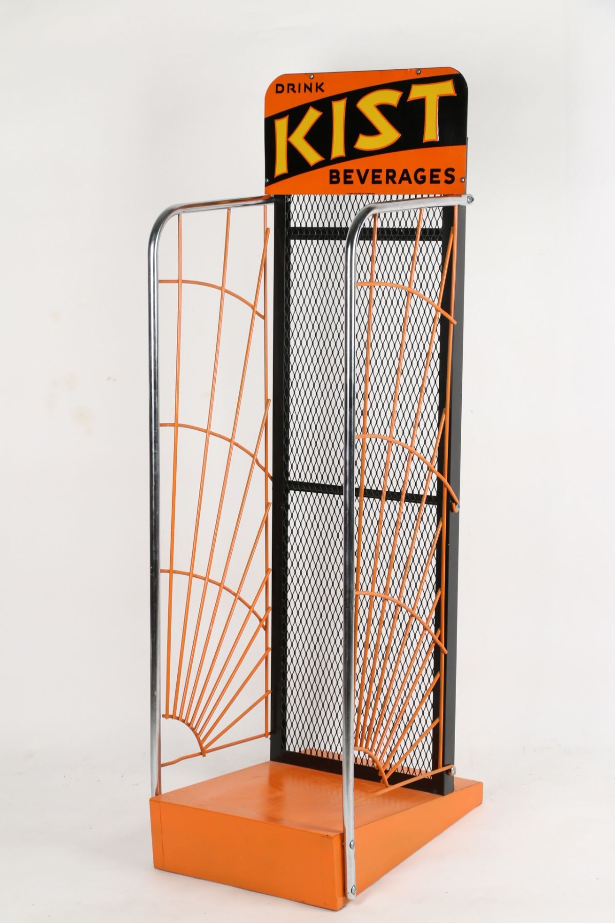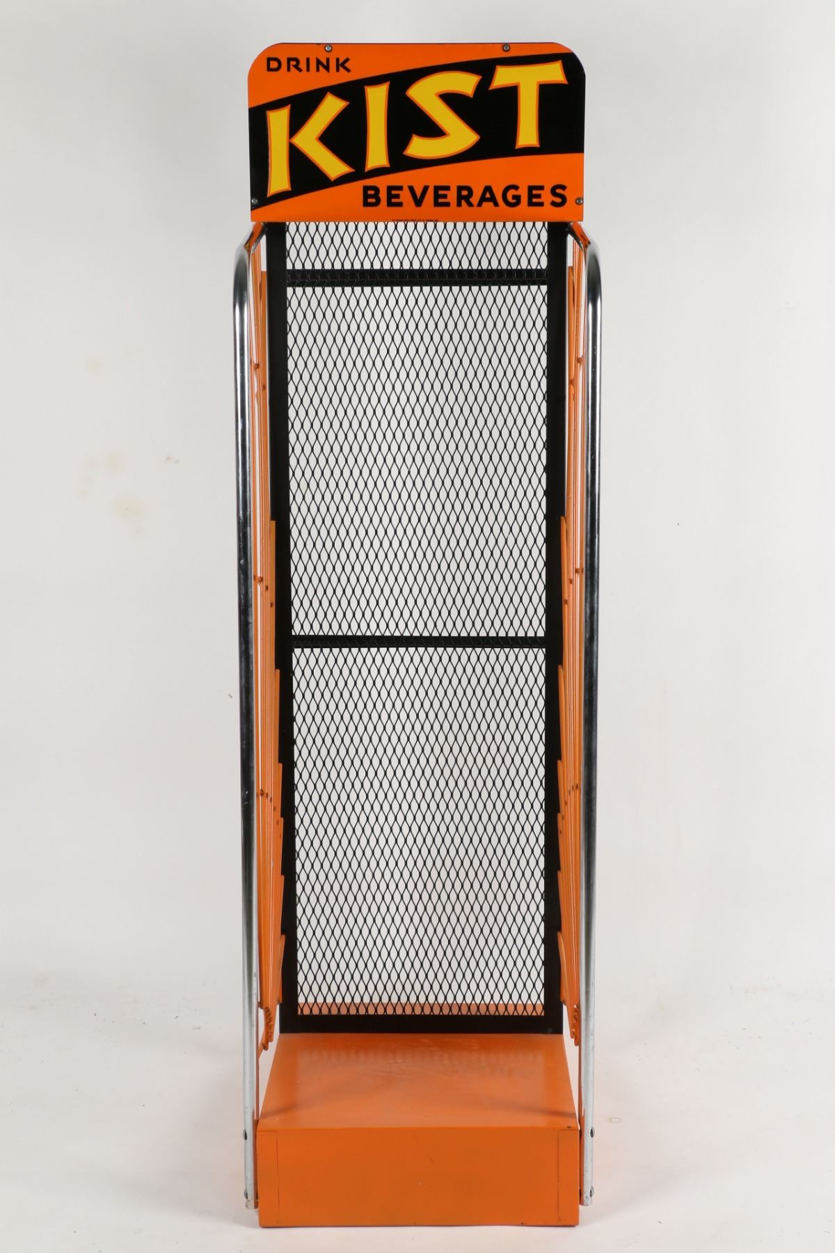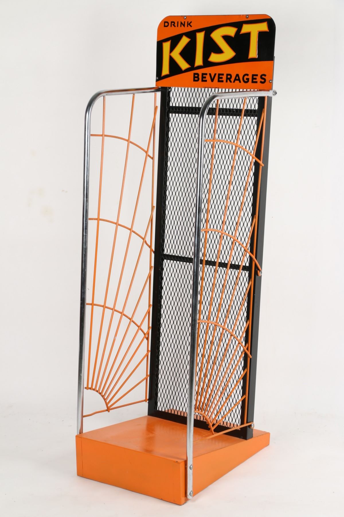 Canadian. Circa 1940s. Embossed sign. Art Deco. Marked, "St. Thomas Metal Signs Limited, St. Thomas" lower edge. 54.5" x 16.75" x 20.5". Sign: untouched original. Very minor edge creases. Rack: professionally restored. $200-300.