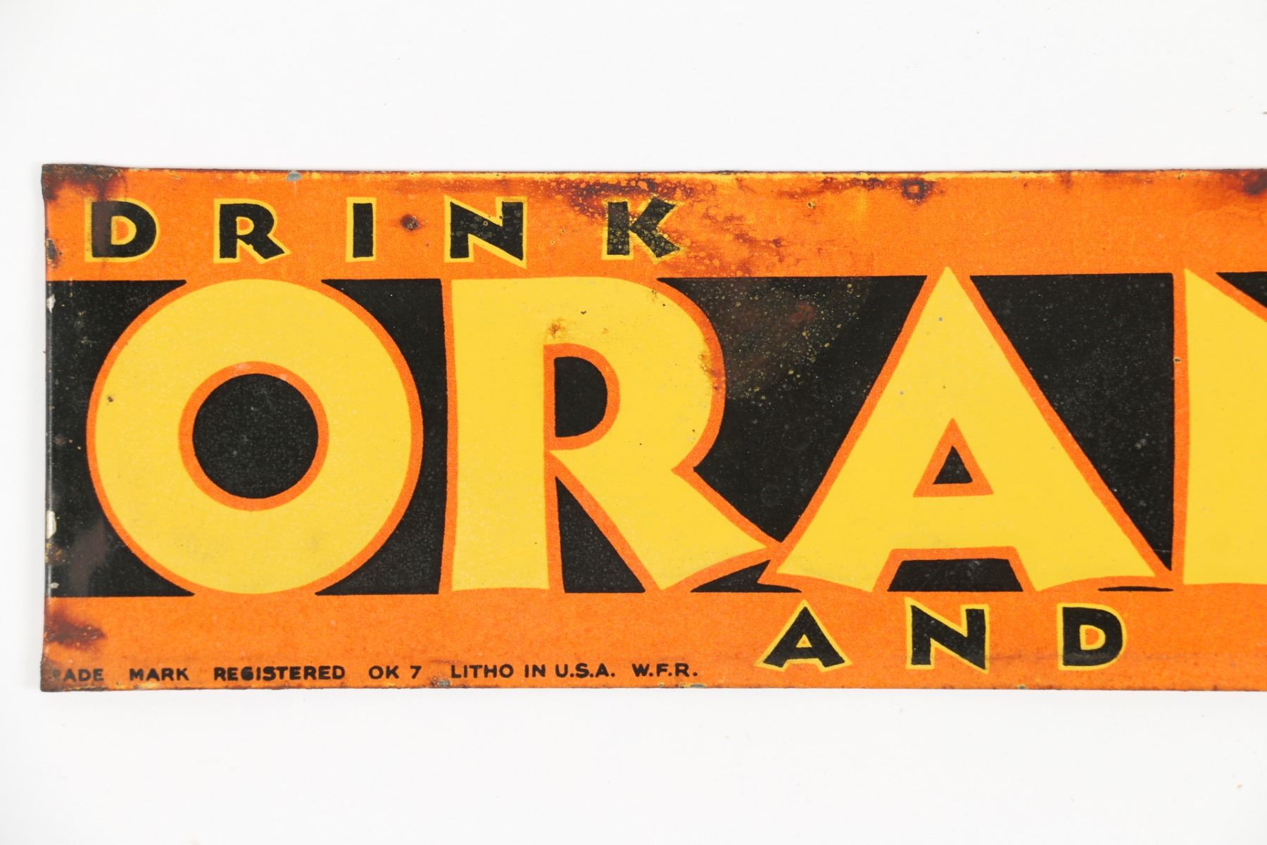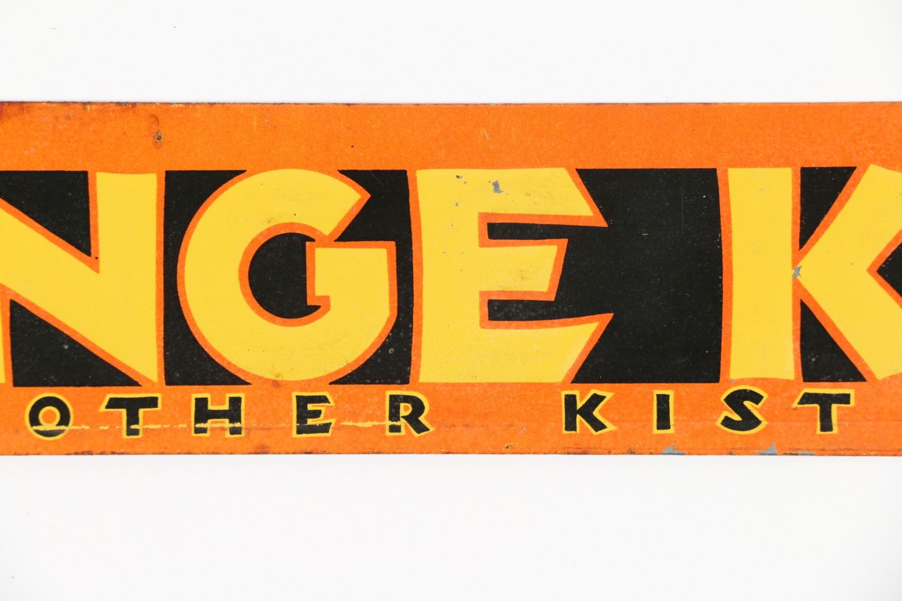 American. Circa 1940. Embossed. Marked, "Trade Mark Registered OK 7 Litho in USA WFR". 2.5" x 17.75". Light surface rust, mostly isolated to the edges. Surface scratches.$200-300.
