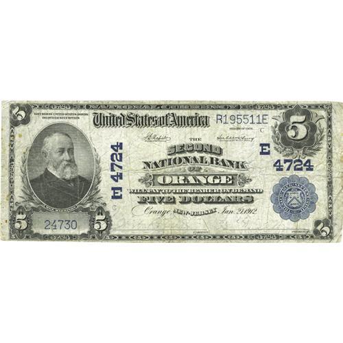 <B>Orange, NJ</B></I> - $5 1902 Plain Back Fr. 602 <B>The Second NB</B></I> Ch. # (E)4724<BR>Of the two issuers located here, this was the only one still standing by the end of the National Bank Note era, its competitor, the Orange National Bank, having closed its doors forever in 1933. <B>Fine.</B></I>