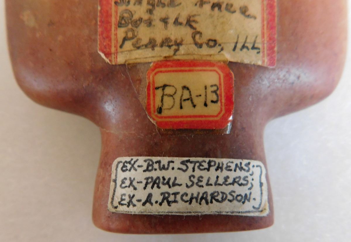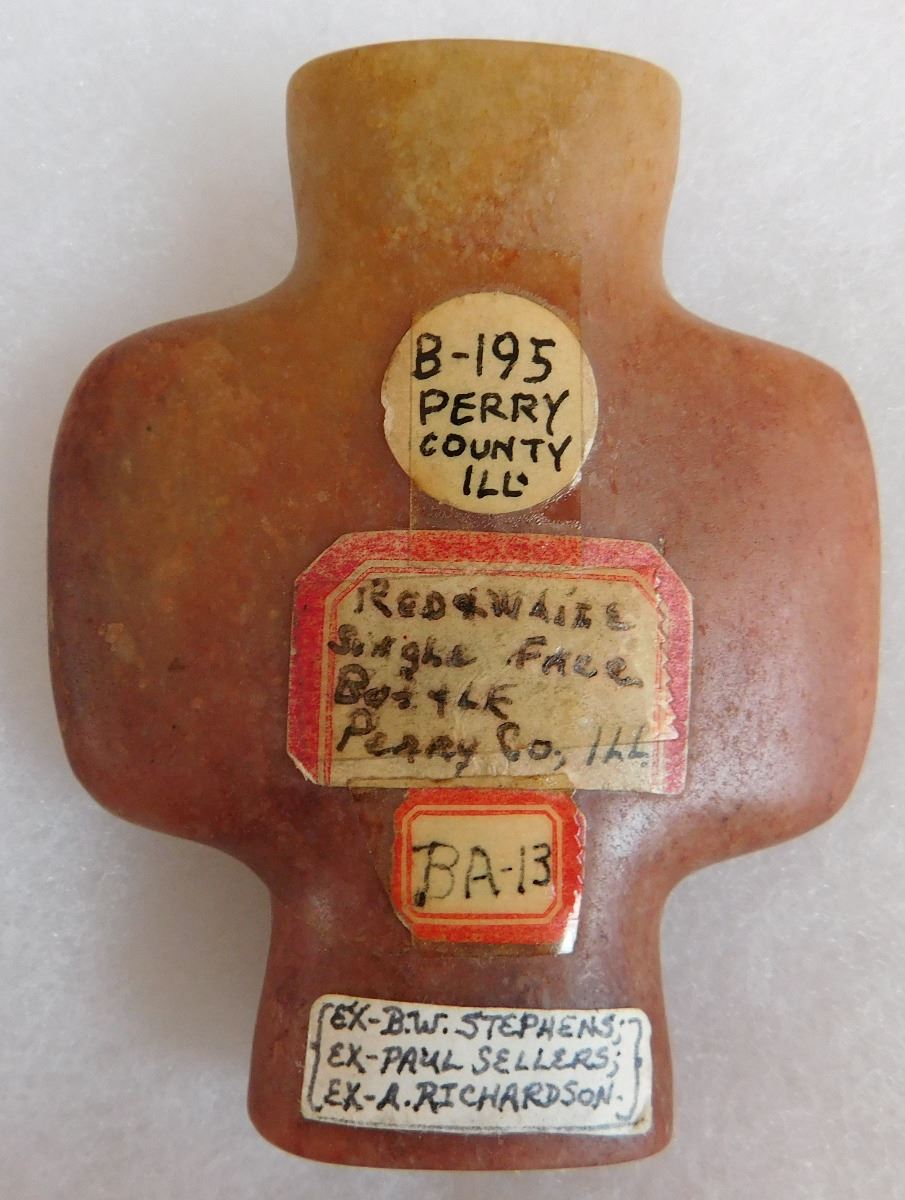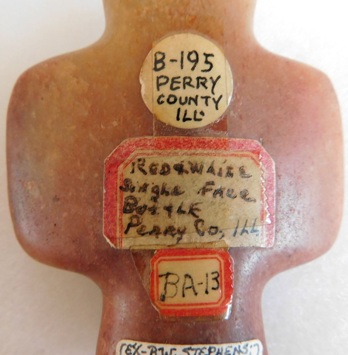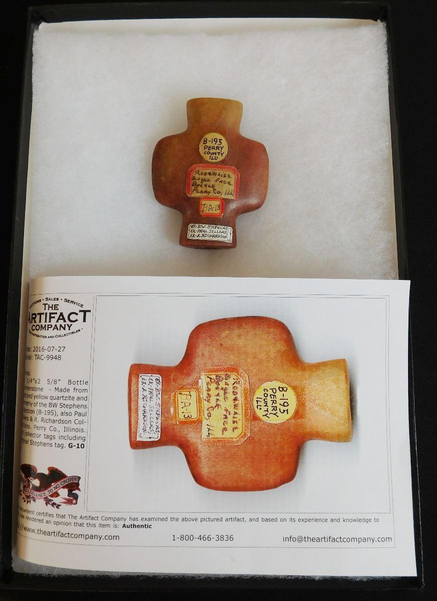 Orange Quartz Bottle Bannerstone, pre-histori citem. Made of Ferris Bearing Quartz, this item measures 3.25" x 2 5/8". From Perry County, Illinois. Ships with Certificate of Authenticity by The Artifact Company. Ex-B.W. Stephens collection. Condition: Fine, museum piece, see images. Shipping: $40.00 w/insurance.