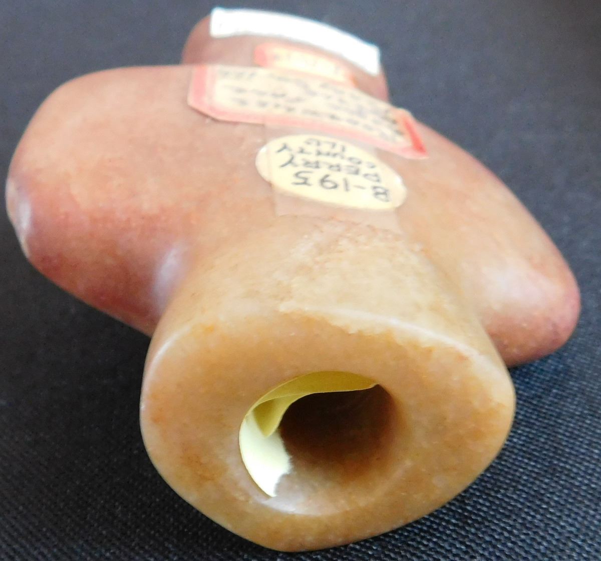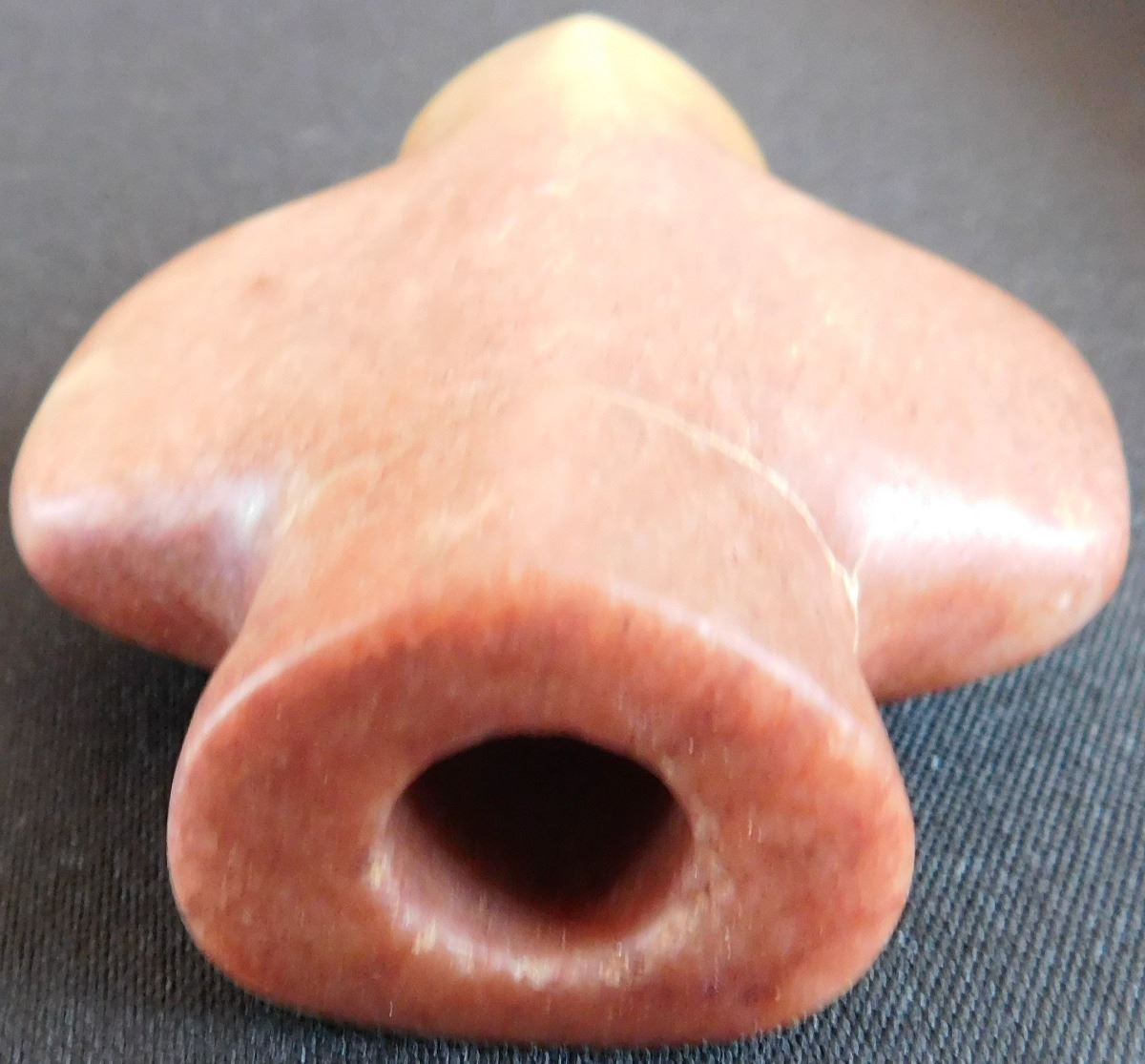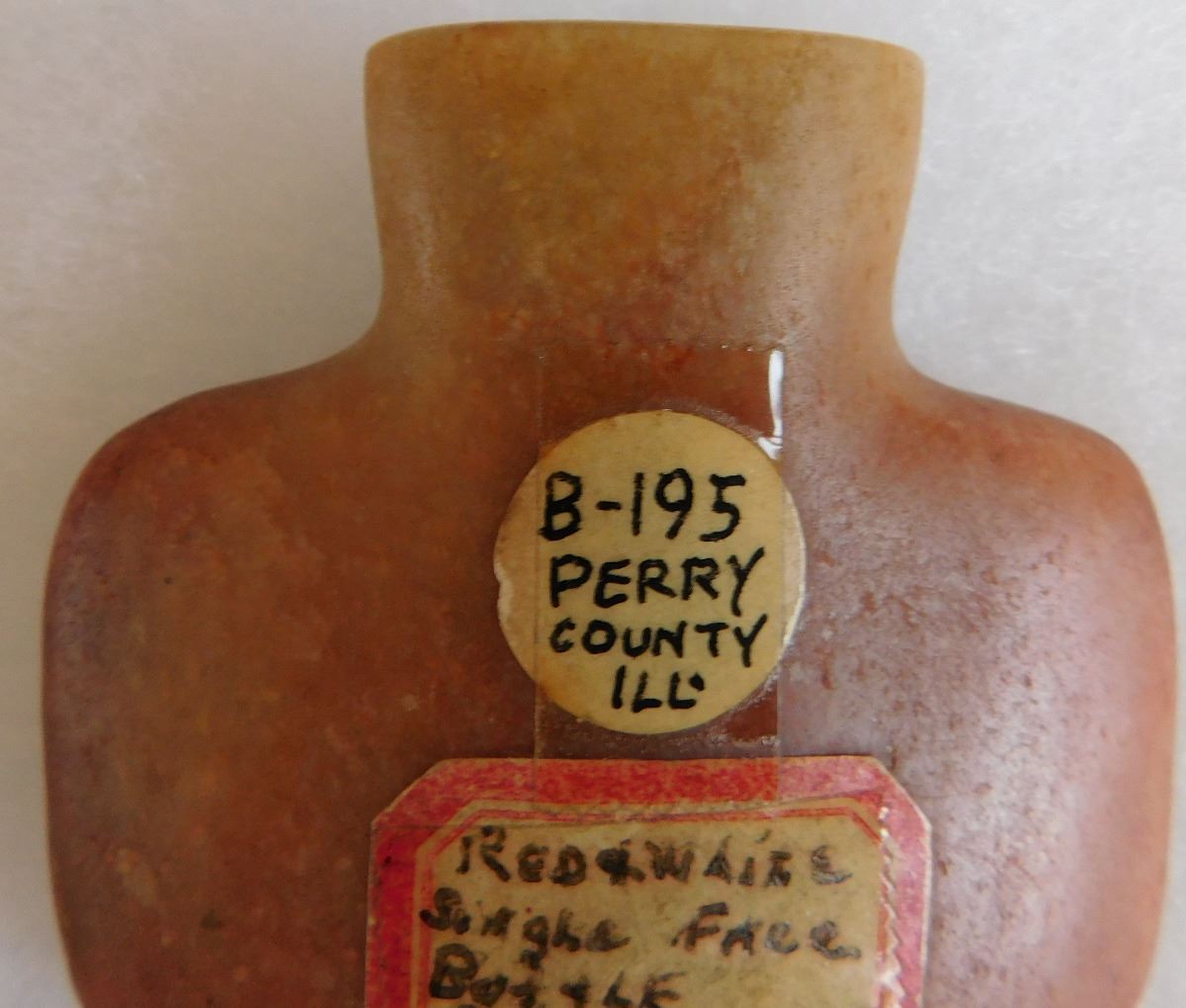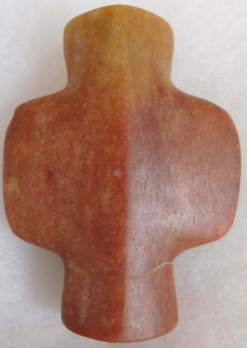Orange Quartz Bottle Bannerstone, pre-histori citem. Made of Ferris Bearing Quartz, this item measures 3.25" x 2 5/8". From Perry County, Illinois. Ships with Certificate of Authenticity by The Artifact Company. Ex-B.W. Stephens collection. Condition: Fine, museum piece, see images. Shipping: $40.00 w/insurance.