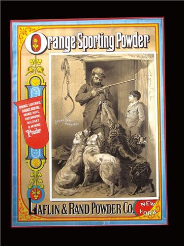 Orange Sporting Powder Co. Paper Poster, Laflin and Rand. Depicting hunter, boy and four dogs. A great image on a very early piece. Some small tears around perimeter, minor restoration at lower right corner otherwise excellent condition. 17 X 23 inches.