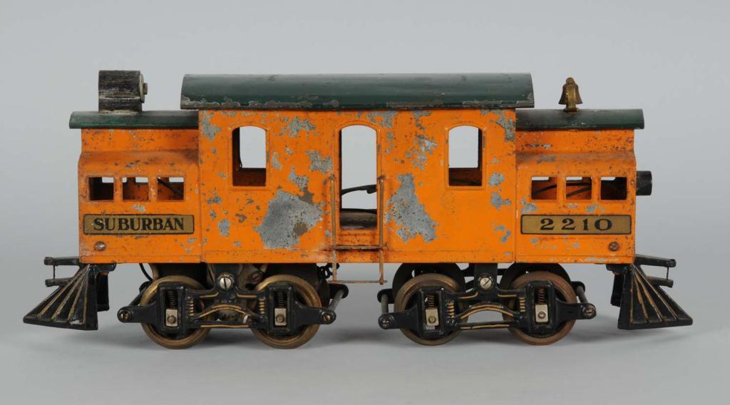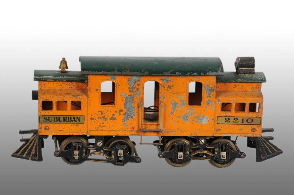 Circa 1914. Rare color example with orange sides and green roof . Orange sides show considerable paint flaking and pitting. Locomotive roof shows scratching and flaking in small areas. All decals are intact. Complete and all original. Good to good plus condition. Pre-war Train