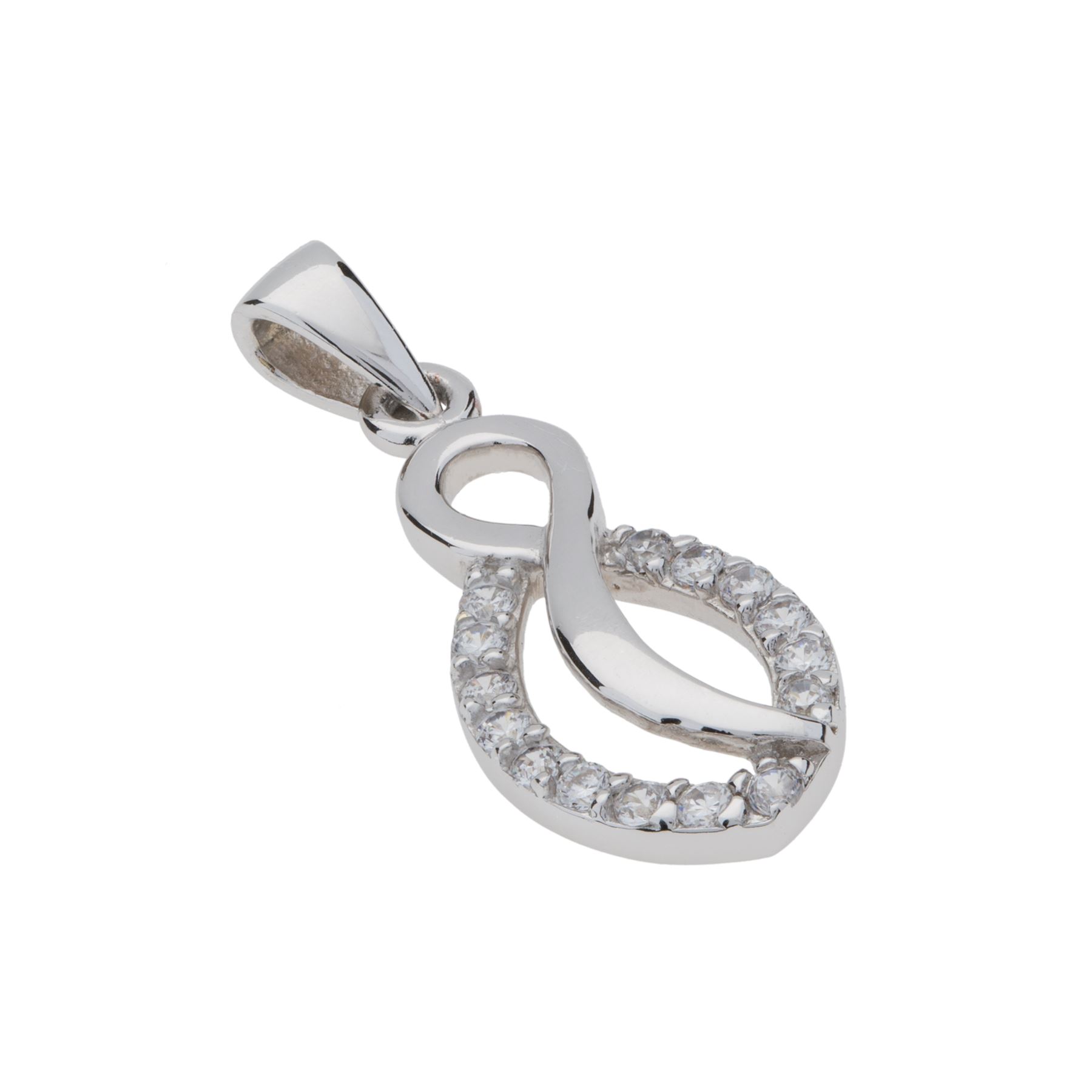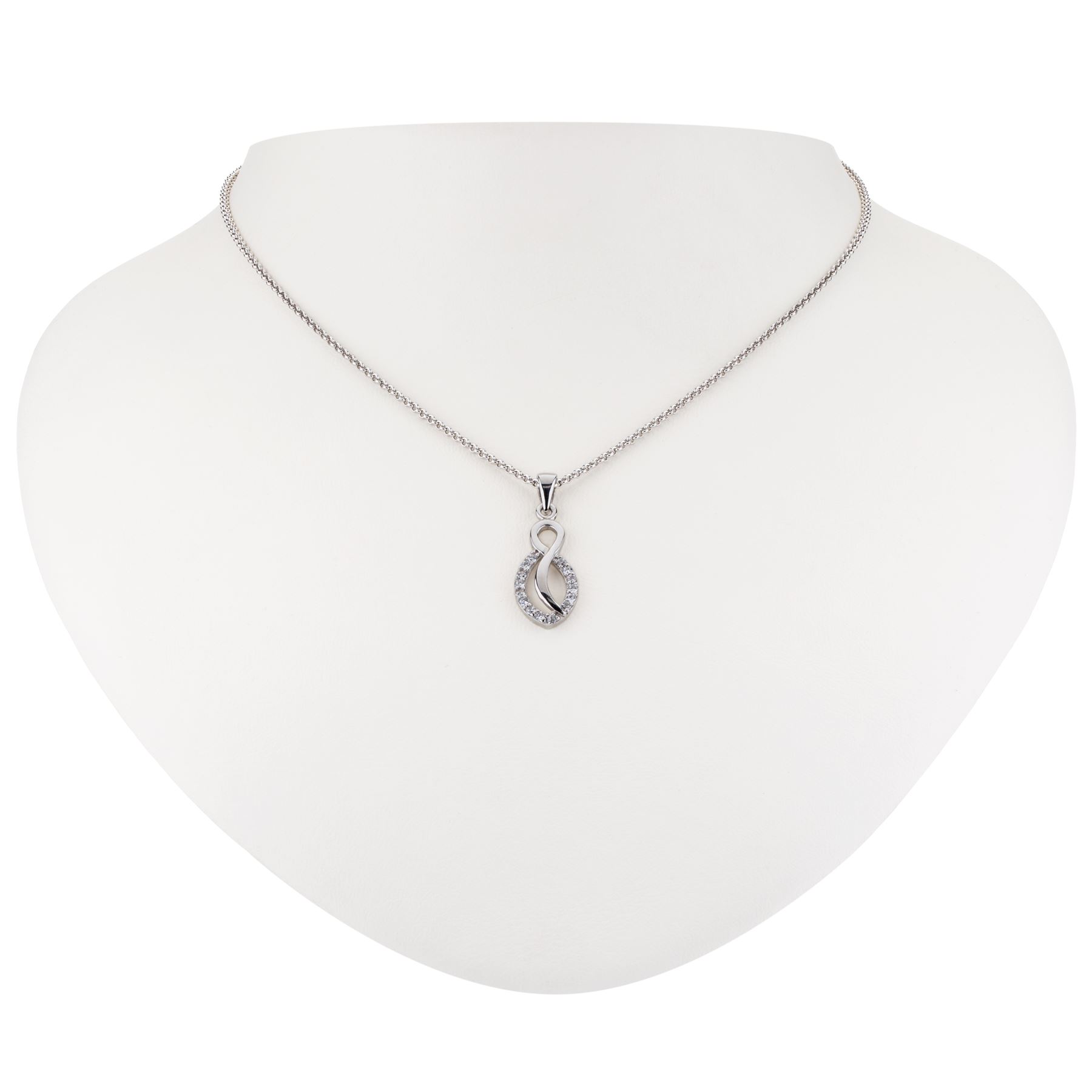 A lovely design from Eberle’s Radiance Collection! An organic swirl design pendant is beautifully crafted in gleaming anti-tarnish rhodium over brass and embellished with a sparkling pure white cubic zirconia. A complementary 18” cable chain completes the look. Expand your collection with this versatile pendant necklace today.