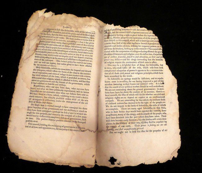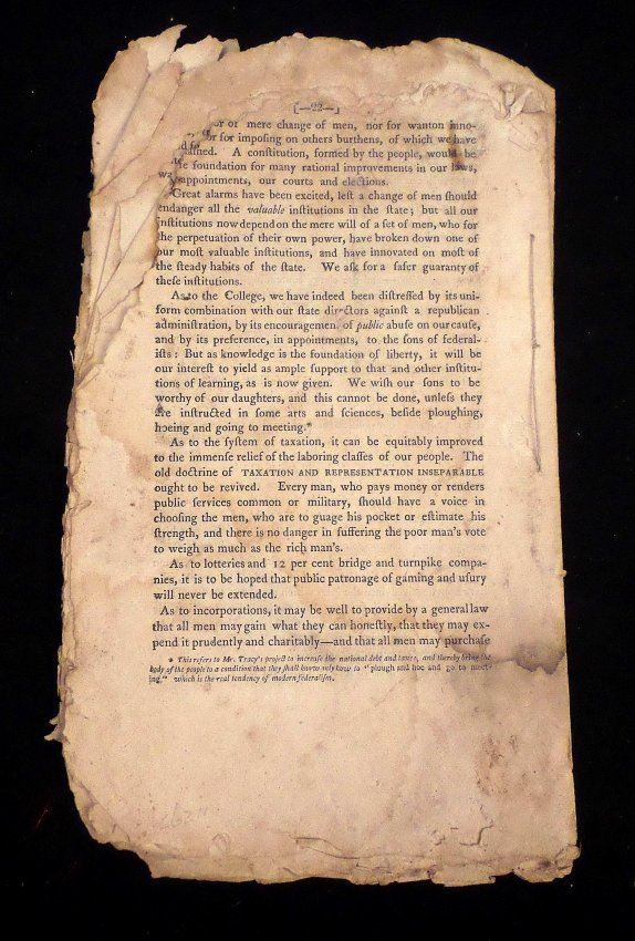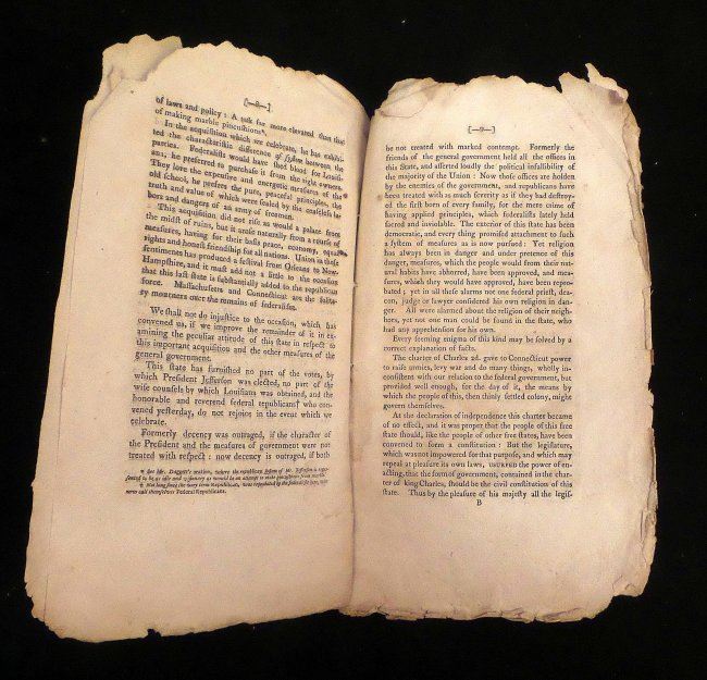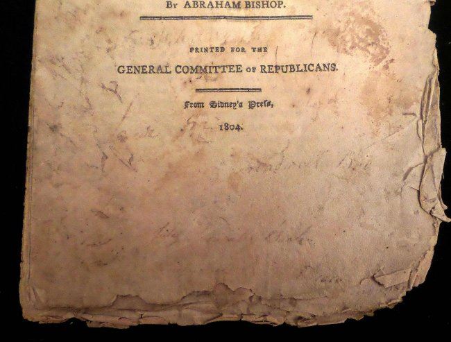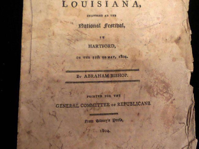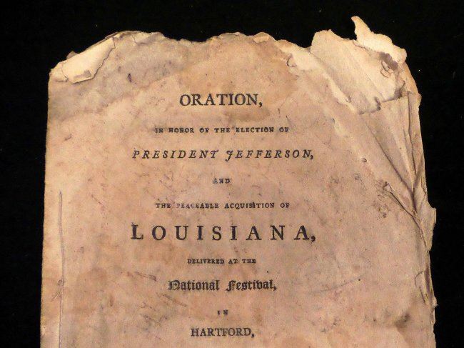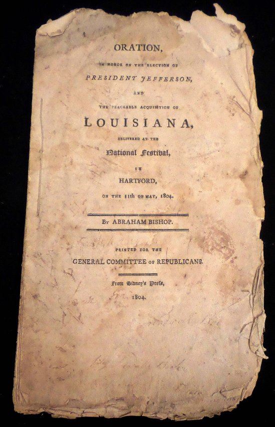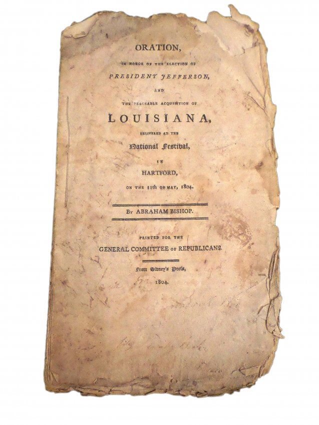 1804 Pamphlet, "Oration, in Honor of the Election of President Jefferson, and the Peaceable Acquisition of Louisiana Delivered at the National Festival in Hartford, on the 11th of May, 1804" by Abraham Bishop. [9 1/4" H x 5 3/8" W], 22 pages. "Printed for the General Committee of Republicans" from Sidney's Press, 1804". Severe chipping with losses at edges, toning throughout, few pages bear water stains and last sheet is missing. Sold as is.