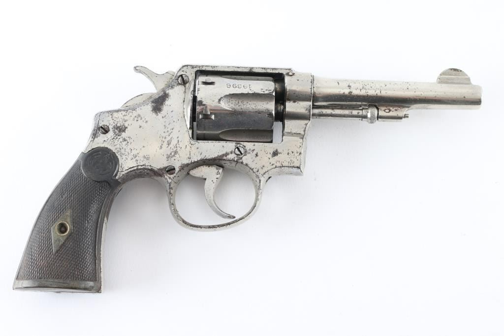 Spanish made double action medium frame revolver, apparently adapted to fire 8mm Lebel Ordnance Revolver cartridges. Many of these were made during WWI for the French military. The appear to be a close copy of the Smith & Wesson hand ejector 5-screw Military & Police revolver, with some internal changes. Features pinned 4-3/8" barrel with half moon front sight, fixed u-channel rear sight, 6 shot fluted cylinder, checkered black composition "OH" logo grips, hole in butt for lanyard ring (removed), nickel plated finish (appears re-nickeled, likely originally blued). Bore is good condition, strong rifling, has dark grooves that might clean out. Nickel finish is fair condition, 80% coverage with much flaking & peeling, some bubbling of patina. Barrel markings have been lost to the refinish process. Grips are good with small chips, no visible cracks, slight shrinkage. Action is a bit stiff, timing is good, lock-up is fair. Condition is NRA Fair+ *** C&R Firearm ***