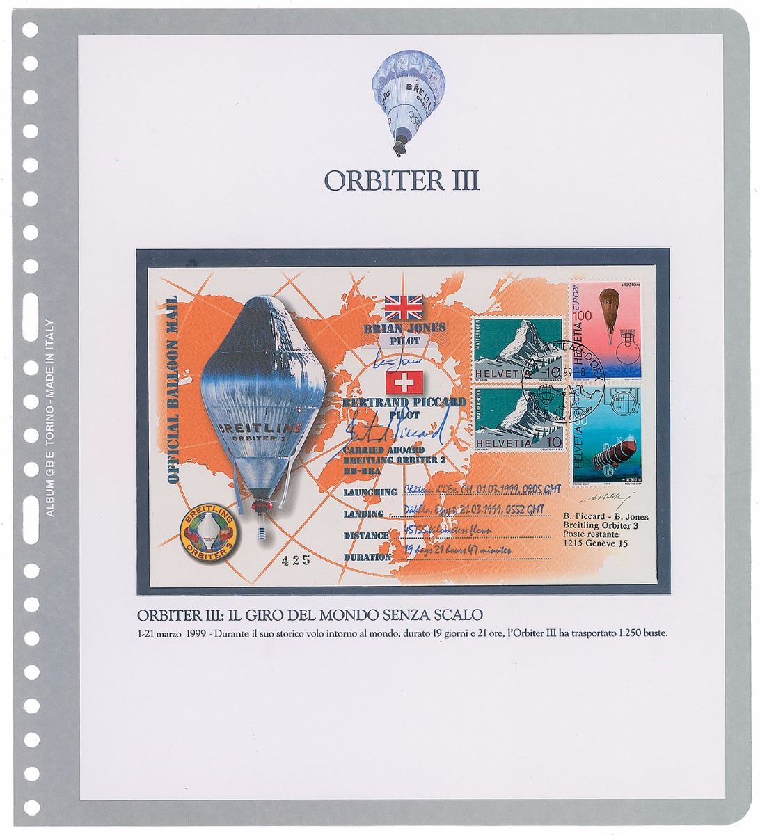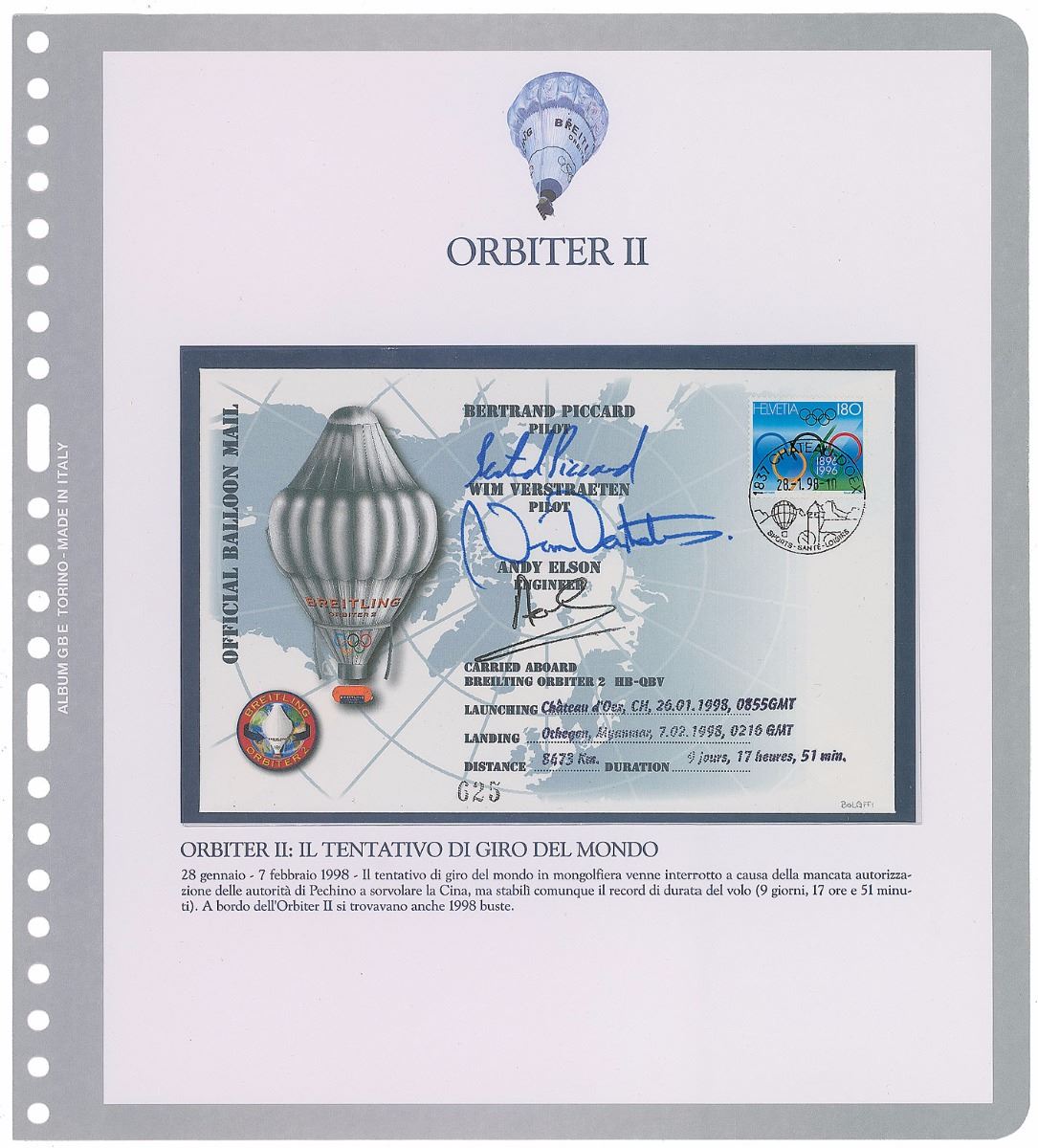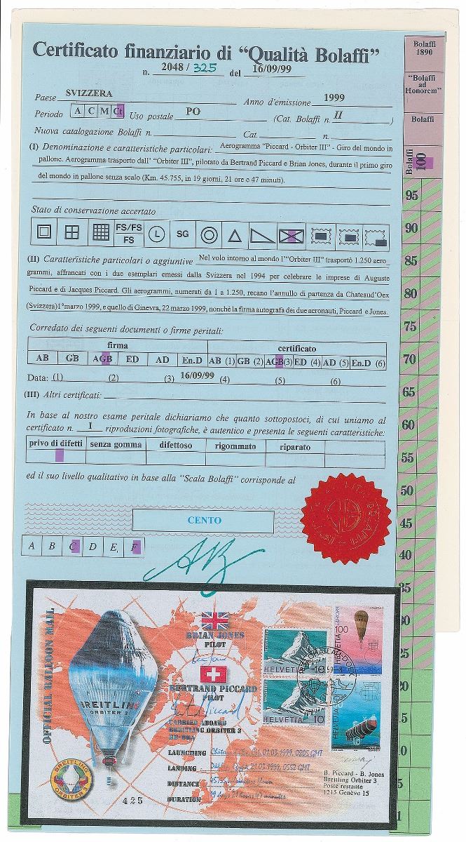 Two official balloon mail commemorative covers with cachets honoring the Breitling Orbiter II and III balloons, both 7.5 x 4.75, postmarked January 28, 1998, and March 1, 1999. The Orbiter II cover is signed in blue felt tip by pilots Bertrand Piccard and Wim Verstraeten, and in black felt tip by engineer Andy Elson; the Orbiter III is signed in blue ballpoint by pilots Brian Jones and Piccard. Includes an unsigned cover honoring Orbiter III. In overall fine condition. Also accompanied by a folder and certificate of authenticity from Qualita Bolaffi. After the Orbiter’s first two attempts were unsuccessful, the Orbiter III became the first balloon to fly around the world nonstop, achieving the record in 19 days, 21 hours, and 47 minutes.