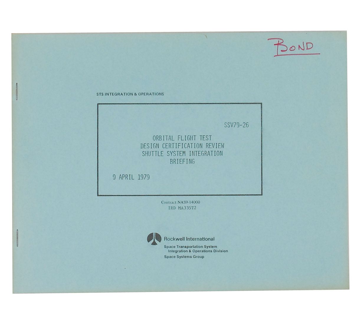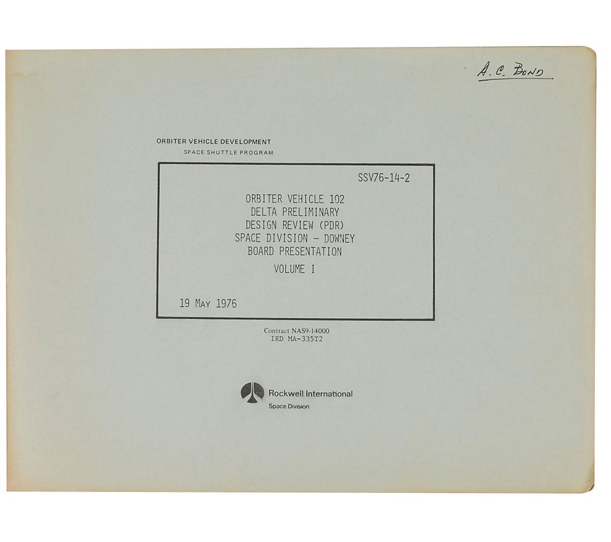 Two shuttle manuals originally belonging to Aleck C. Bond, both prepared by Rockwell International. Manuals are titled: Orbital Flight Test Design Certification Review Shuttle System Integration Briefing, and Orbiter Vehicle 102 Delta Preliminary Design Review (PDR) Space Division—Downey Board Presentation Volume I. Both have Bond’s name written on the front cover. In fine condition. Bond was NASA’s manager of System Test and Evaluation for Mercury though Apollo, then served as Assistant Director for Program Support for the shuttle program.
