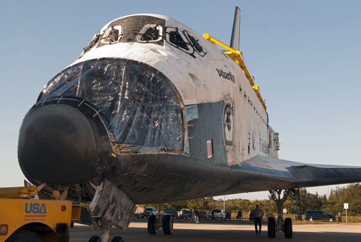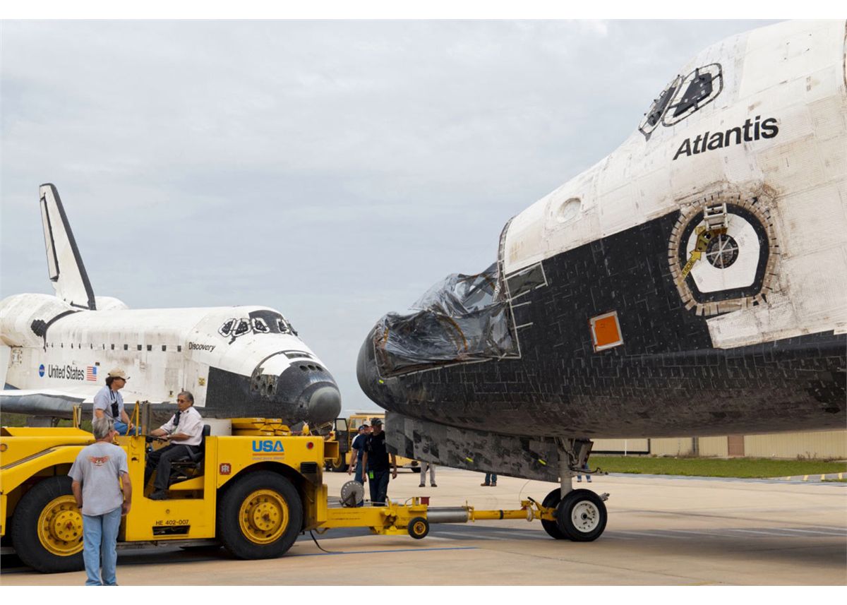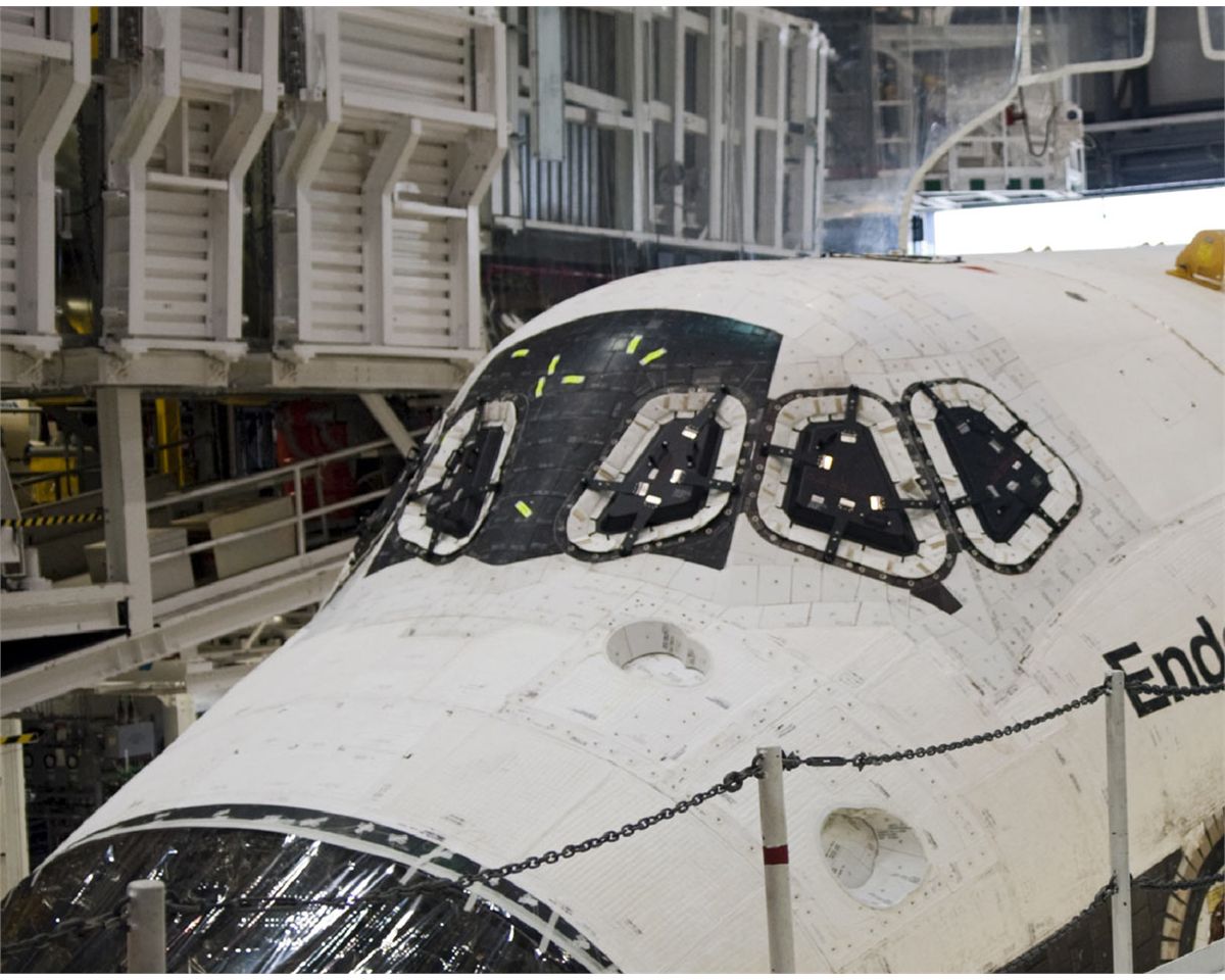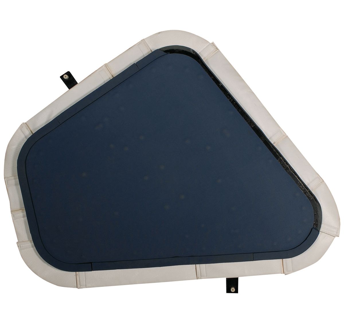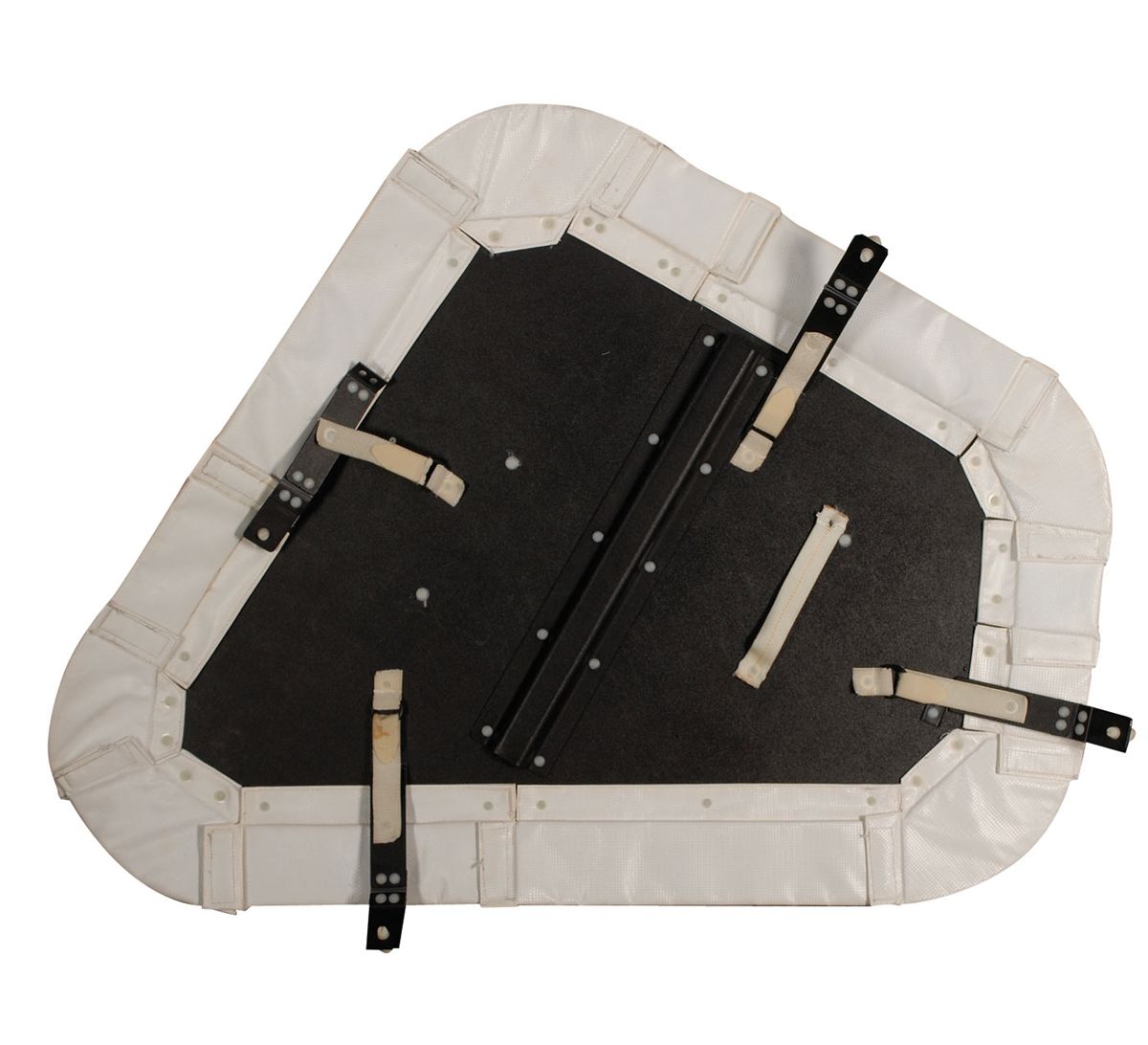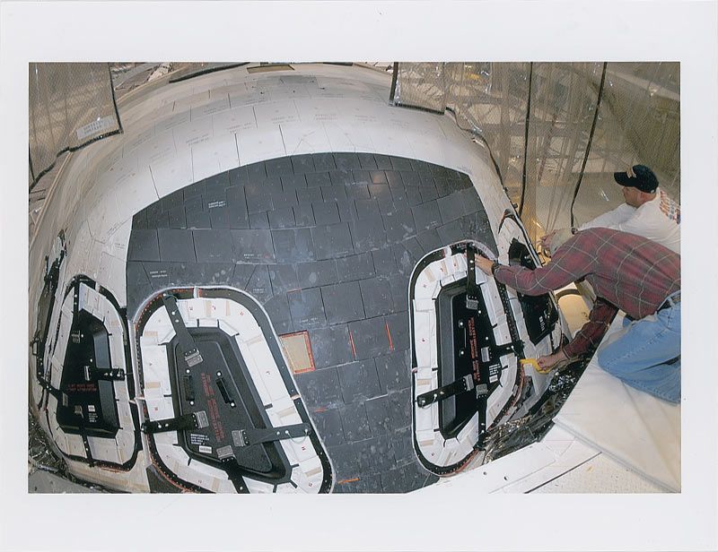 Orbiter second generation, early prototype hard window cover. Cover measures approximately 32.5 x 30. Constructed inside the Orbiter Processing Facility at the Kennedy Space Center, one side of the cover features a contoured foam rubber pad which would be placed against the window for protection. Opposite side has a hard plastic center with several canvas handles and several plastic clasps where straps could be affixed to hold the covers in place. Accompanied by one photo of the final model of the covers being attended to by engineers. In fine condition.
