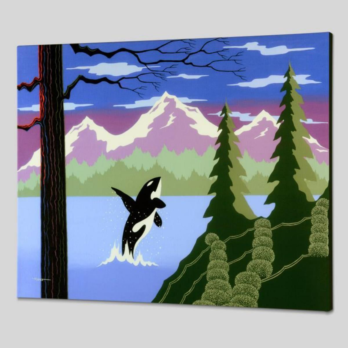 Larissa Holt, a student of distinguished artist Eyvind Earle (1916-2000), uses bold colors and breathtaking scenery to create images of Nature in her own unique style. "Orca" is a limited edition giclee on stretched canvas by Holt, numbered and bearing Holt's authorized signature. This piece comes gallery wrapped. Includes Letter of Authenticity. Measures approx. 27" x 21.5" x 1.5" (image). Reference #: 237468.