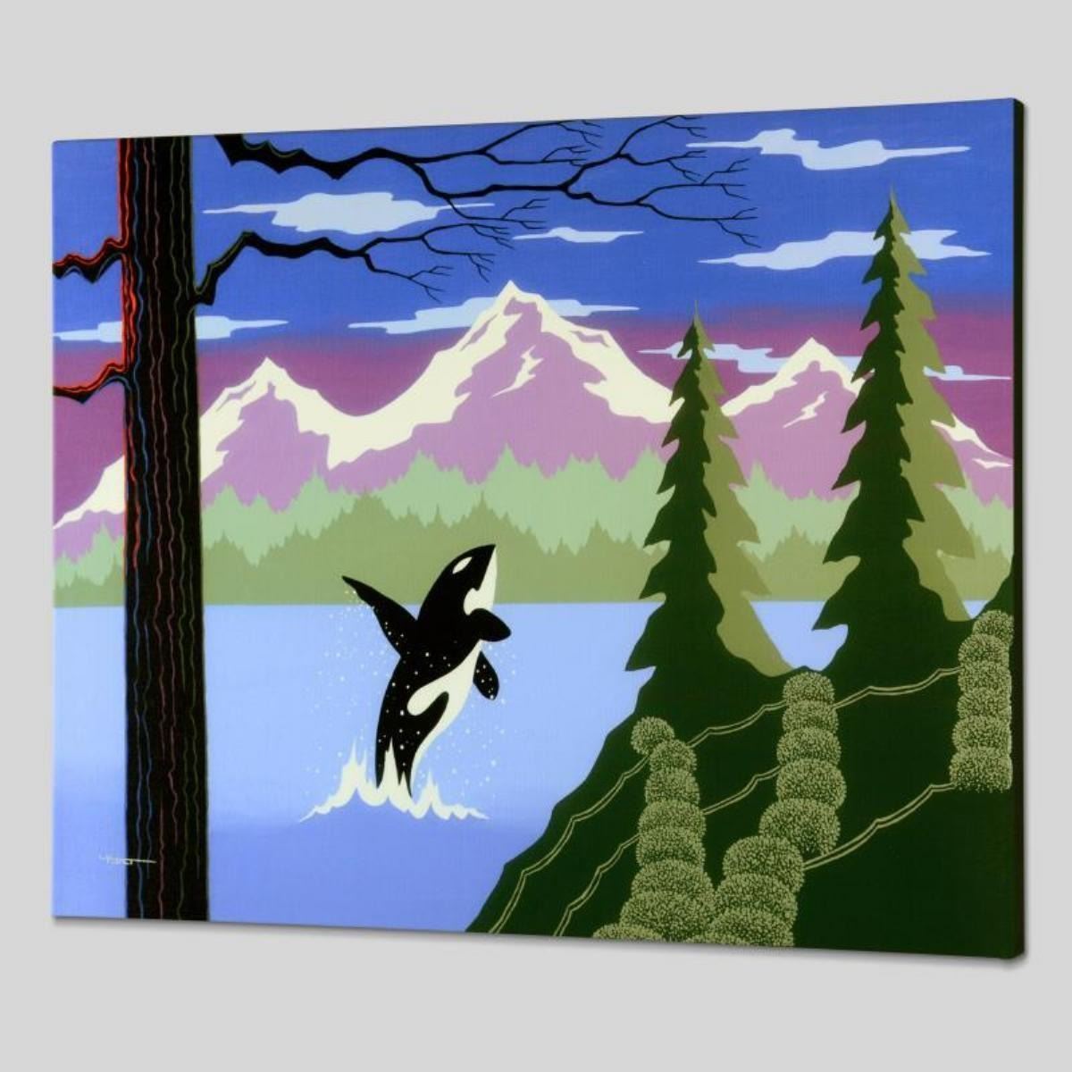Orca by Holt, Larissa. Larissa Holt, a student of distinguished artist Eyvind Earle (1916-2000), uses bold colors and breathtaking scenery to create images of Nature in her own unique style. "Orca" is a limited edition giclee on stretched canvas by Holt, numbered and bearing Holt's authorized signature. This piece comes gallery wrapped. Includes Letter of Authenticity. Measures approx. 27" x 21.5" x 1.5" (image). This item requires special handling and may have a longer than usual turnaround.
