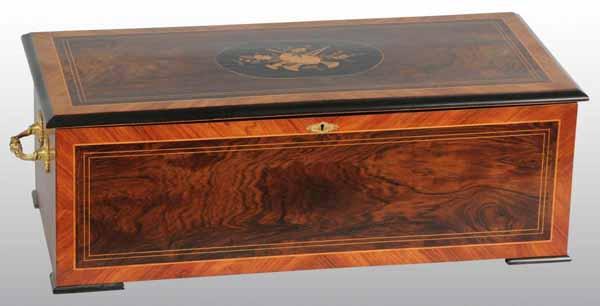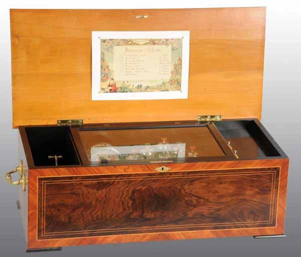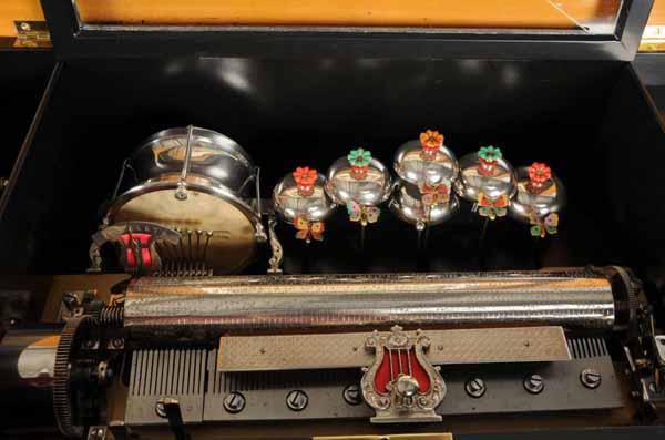 Description Includes eight tunes, six bells, 6 butterflies, strikers, drum in refinished inlaid case with zyther. Working. Condition (Refinished). Size Cylinder: 13" L.