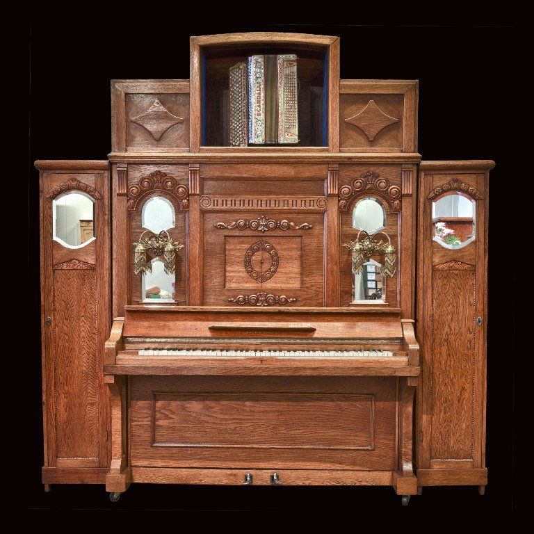 Orchestrion Kuhl & Klatt. Sehr schönes Gehäuse mit Spiegel und Leuchtern. Später vermutlich von Eugen DeRoy im Zeichen der Zeit dazu gebautes Scandalli Akkordeon und 2 Seitenschränke für die Rollen. Mit Holzblock und Triangel. Mit 7 Rollen. Museumsqualität. 232 x 79 x 238cm. Kuhl & Klatt, Berlin, Germany, circa 1920/35.