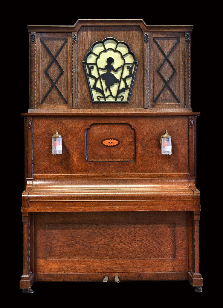 Orchestrion Popper «Happy Jazz». Very popular orchestrion of its time. Popper was successfully trying with the Instrumentation (Piano, mandolin, bass drum, snare drum, wood block, cymbal and triangle) and the arrangements of the melodies to catch and reproduce the typical «Jazz mood» of the roaring twenties. With 10 rolls. Well playing. 148 x 77 x 232cm. Popper & Co., Leipzig, Germany, circa 1925.