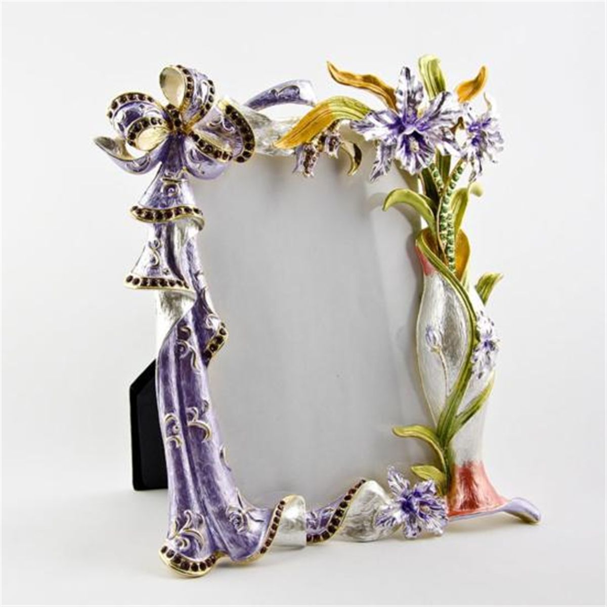 Orchid Flowers Picture Frame, Faberge Orchid Photo Frame is beautifully crafted by enameled technique. The purple orchids are surrounded by yellow enameled leaves. The purple, yellow, green, and white colors are carefully picked to make the photo frame look like a true beauty! Dimensions: 7in (H) x 6in (L), Material: Pewter, Enamel, Crystals.