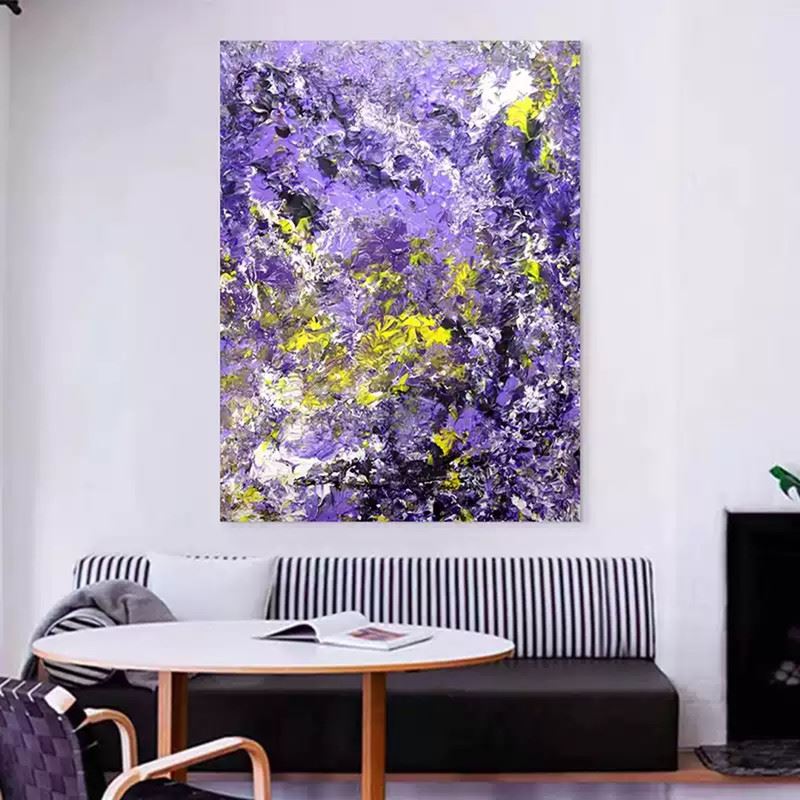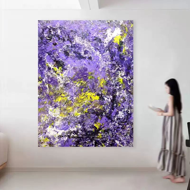 Lavender and violet build up in misty layers, as if filling a hidden ravine, while sparks of gold and white bloom like secret orchids, casting a cool, noble glow into the silence. Dimensions: 24 x 31 inches.