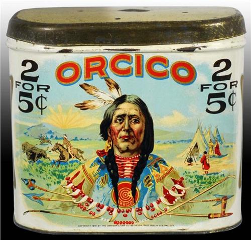 Description Copyrighted 1919. Manufactured by Orrison Cigar Company Incorporated in Mephesto, Ohio marked "Heekin Can Co.". Great display piece with a finely detailed image of an Indian with teepees and buffalo running in background on front and back. Some tarnishing to lid, a few nicks and scrapes and very little wear. Condition (8.4 - 8.8, Excellent). Size 5 - 1/2" x 4" x 6".