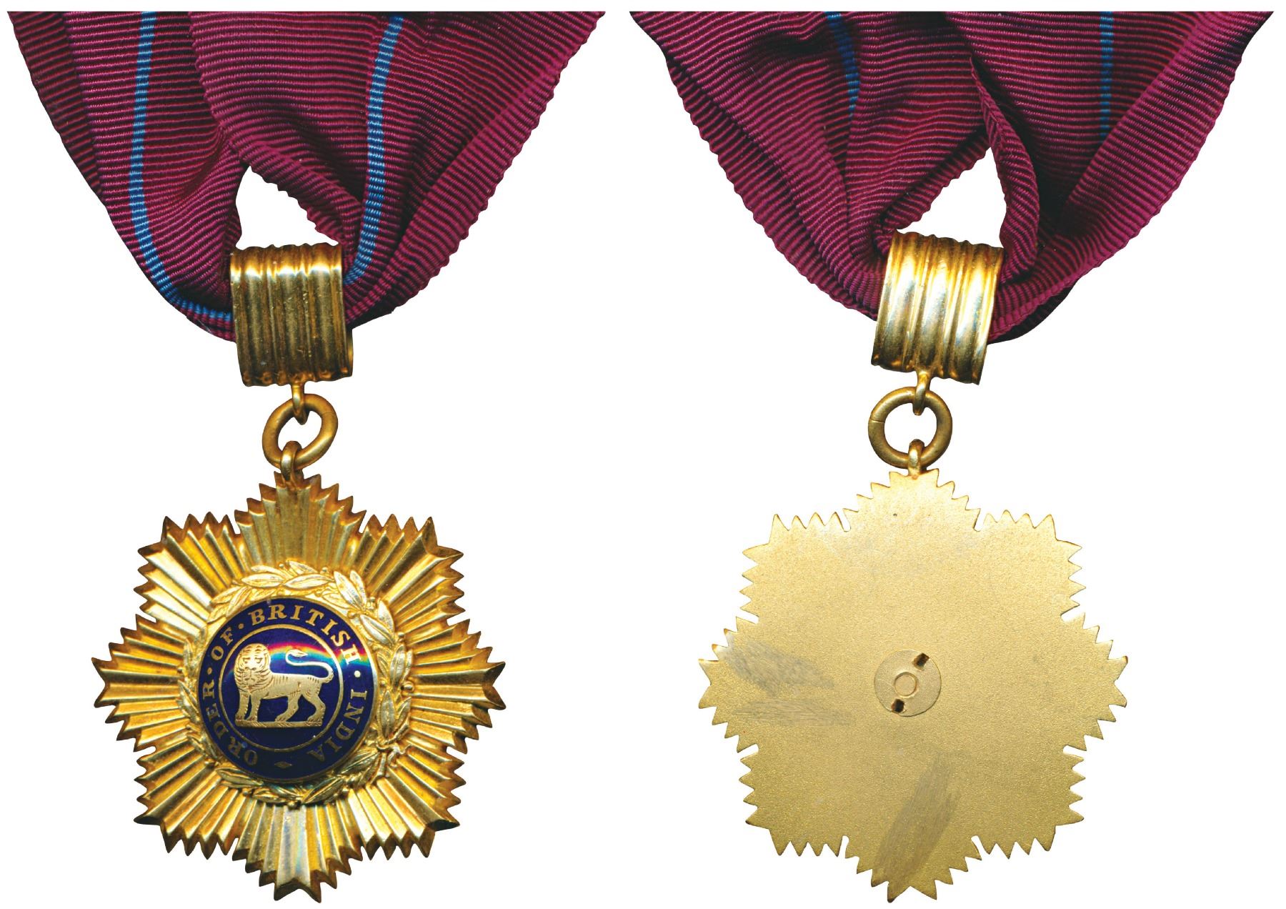 Order of British India, 2nd Class, gold and enamel medal, 28.21g, a gold star, dark blue enameled centre bearing a lion, all within a laurel wreath (MYB 36). Superb Mint State, with ribbon, Very Rare.