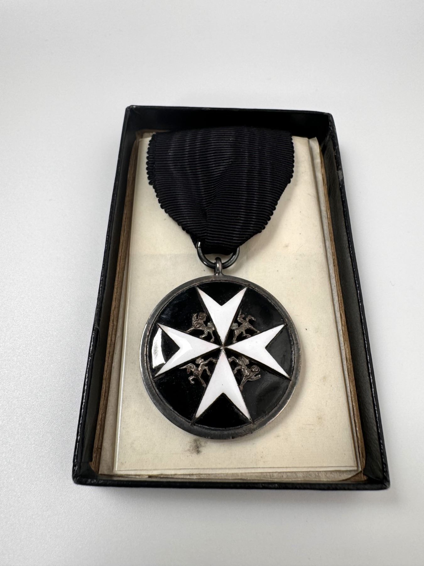 Medal, miniature and pin made of enamel and silver, there is a note in the box saying Médaille Paul Tellier, 26 oct. 56, Ottawa du Gouverneur General, The insignia for all grades of the Order consists of a Maltese cross, embellished alternately in each of its principal angles with a lion and a unicorn. The four arms of the cross symbolize the virtues of Prudence, Temperance, Justice and Fortitude.